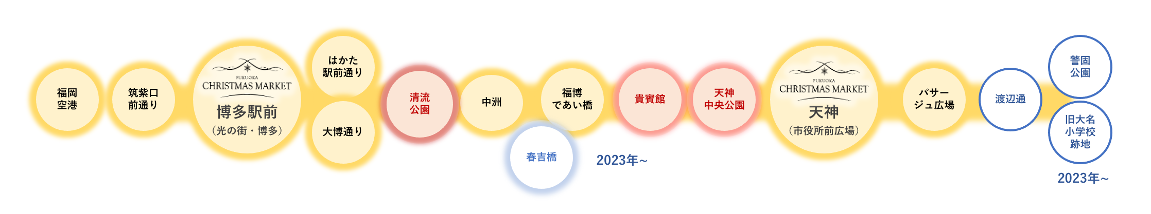 これにより博多から中洲を経由して天神へと都心部に点在する様々な拠点をイルミネーションで結ぶ「光の道」を形成します。