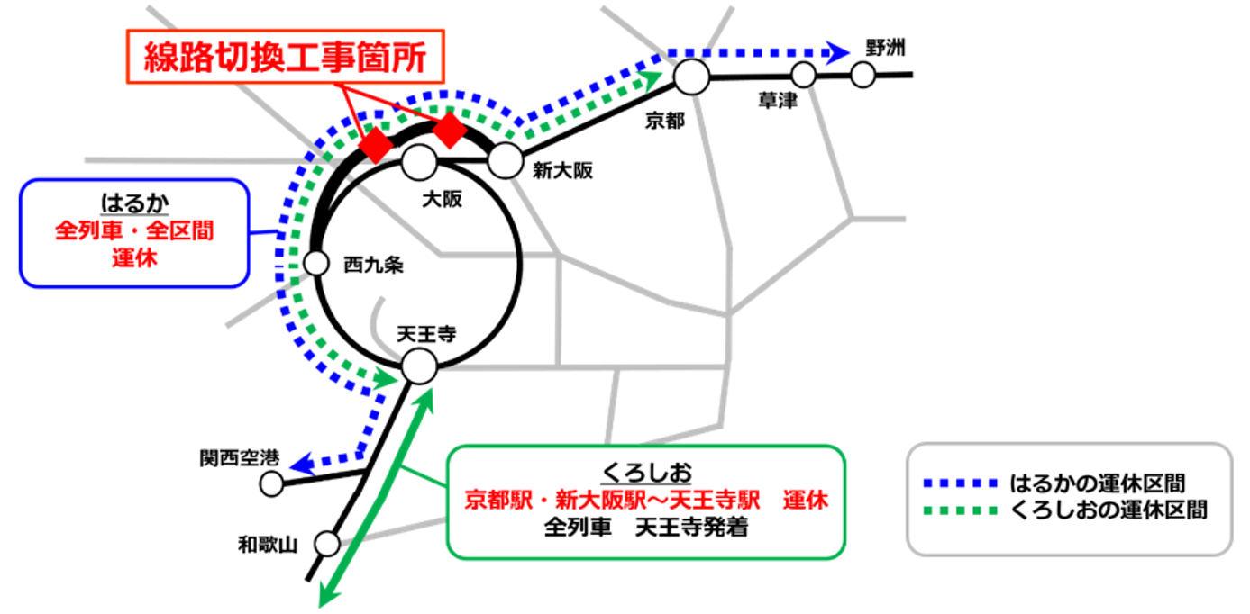 大阪駅(うめきたエリア)開業に向けた線路切換工事に伴い、特急「はるか」の全区間、「くろしお」の一部区間で列車の運転を取りやめます。