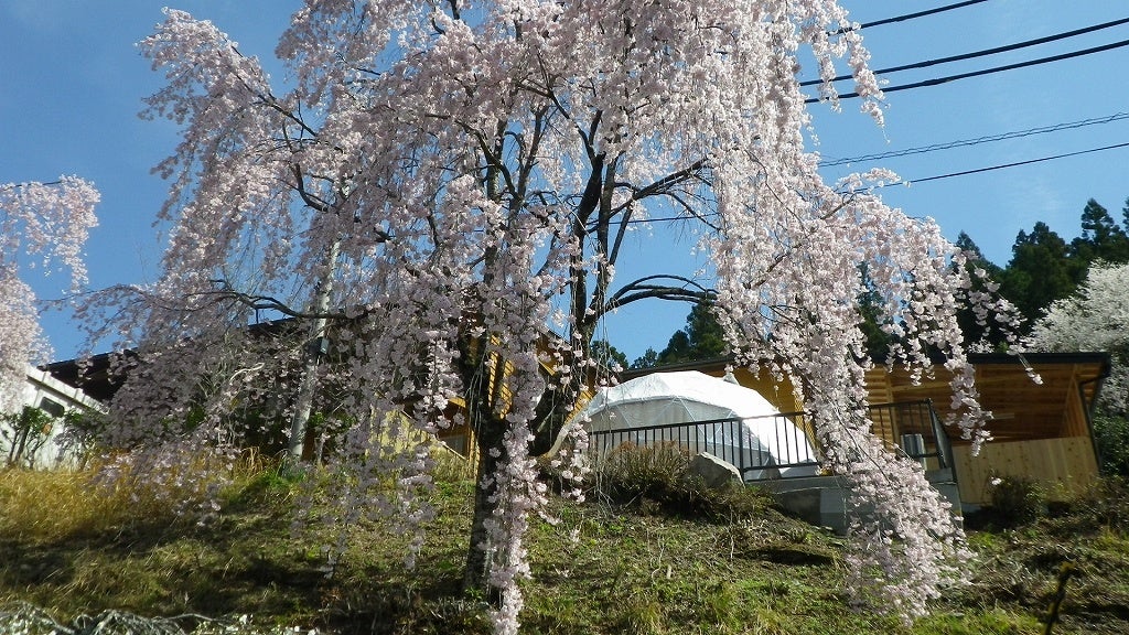 【glampark つるぎの湯の魅力①圧巻の迫力、グランピングドームから覗くたくさんの桜たち】
