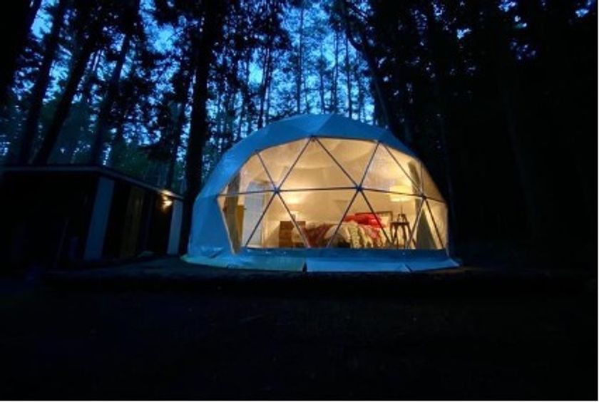 都心からクルマで約90分と抜群のアクセスの良さがありながら、湖、森、山の自然を楽しみ尽くせる河口湖エリア。そんな人気の場所にあるグランピングヴィラハンズ河口湖で、グランピングを楽しめるのがこのコースです。宿泊するのはドームテントです。その最大の魅力は、自然を感じながら、ホテルのように快適に過ごせる点。テントの一部は透明なので、視界には常に森の木々があります。ムササビが飛び交う赤松林には、鹿の親子が遊びに来ます。一方で暖房や個室シャワーブースなど、ホテルのような設備がそろっています。