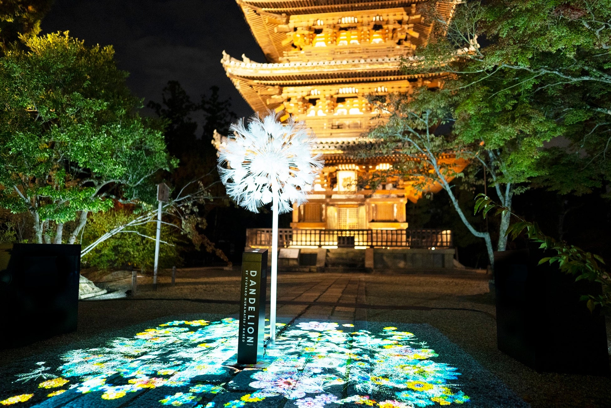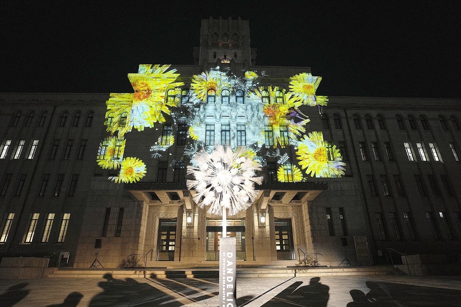 ネイキッドが京都市、宇治市、滋賀県大津市とともに2022年9月15日より開催している次世代アートプロジェクト『NAKED GARDEN ONE KYOTO』では、このアートが京都市役所本庁舎前で開催されたオープニングセレモニーに登場。セレモニーでは、京都市 門川大作市長がDANDELION からタンポポの綿毛を飛ばし、本プロジェクトが皮切りとなりました。セレモニー後は9月15日16日の2日間限定で京都市役所本庁舎前に設置。いつも見慣れた京都市役所本庁舎に突如現れたタンポポのアートオブジェと巨大なプロジェクションマッピングに、行き交う方々は写真を撮ったり、家族を呼んで楽しんだり。近隣の方々や通勤通学の方々を中心に、DANDELION PROJECTにご参加いただき、このアートから平和を願う想いを込めて世界中に花を咲かせました。