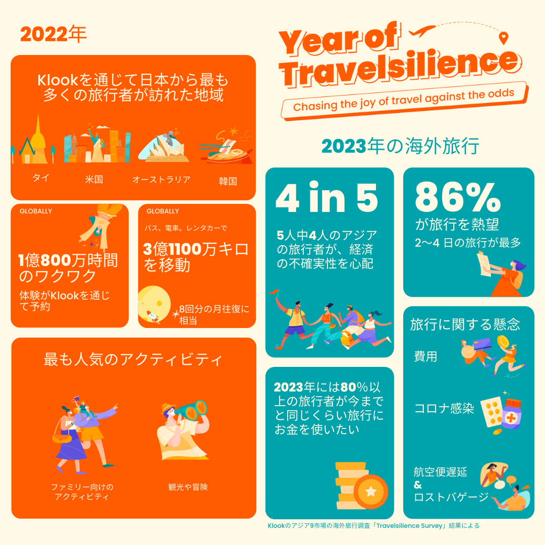 旅行・体験プラットフォームのKlookは、12月13日、アジア9地域で実施した2023年の海外旅行に関するインターネット調査結果を発表しました。それによると、アジアの旅行者の約80%(5人に4人)が来年(2023)の海外旅行について不安を抱いていると回答しました。一方で、80%以上が再び海外旅行へ行くことを熱望しており、3分の1が来年中に2~4回の旅行を計画しているという結果になりました。