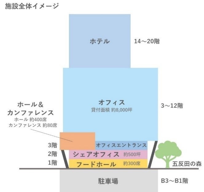 本シェアオフィスは500坪超の空間に、コワーキング・個人利用できる専用デスクやブース・3~30坪の個室を有し、フリーランスやスタートアップなどのニーズに応えたスペースを提供するほか、プロジェクト単位で利用できるサービスなどにより多様な働き方に対応します。加えて、館内およびエリア関係者との多様な交流プログラムや公開空地(五反田の森)を利用した地域で参加できるイベントなどを盛り込むことで、コミュニケーションの活性化を促し、コラボレーションやイノベーションの機会を誘発します。