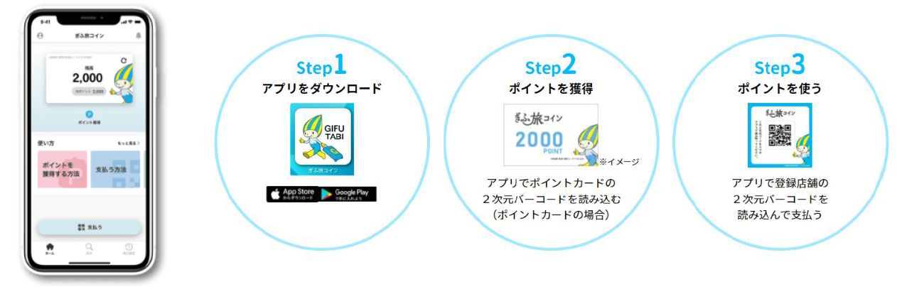 ①スマートフォンから「ぎふ旅コイン」アプリをダウンロードする。