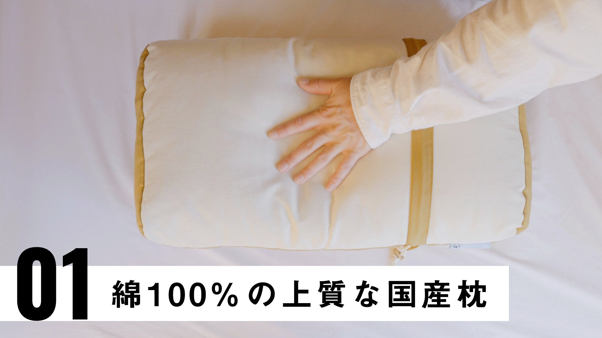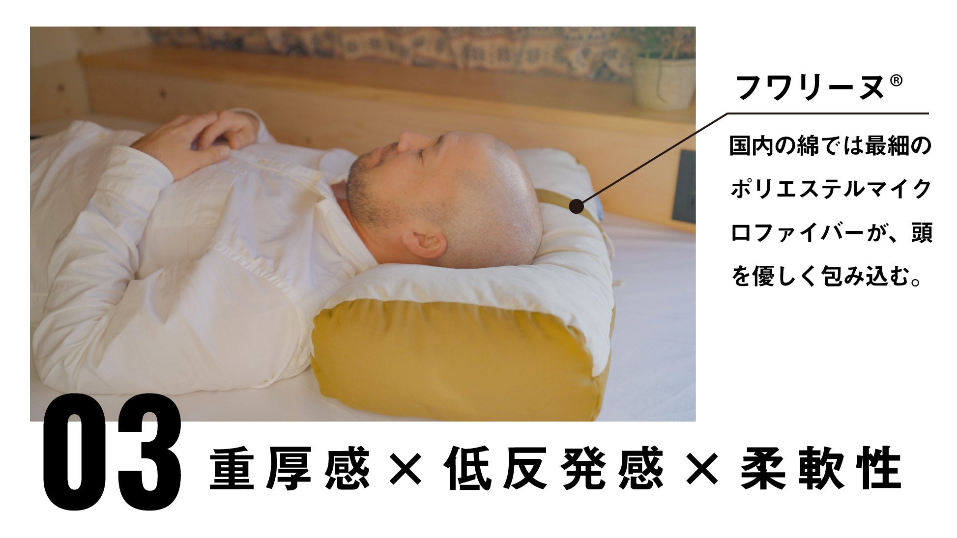 綿にはしっかりとした重厚感と、綿素材には珍しい低反発のようなフィット感を楽しむことができる感触が特徴のフワリーヌ®︎ を使用しています。国内の綿では最細のポリエステルマイクロファイバーで柔軟性も併せもっているため、頭をしっかりと支えながら、寝返りもしやすい素材となっています。