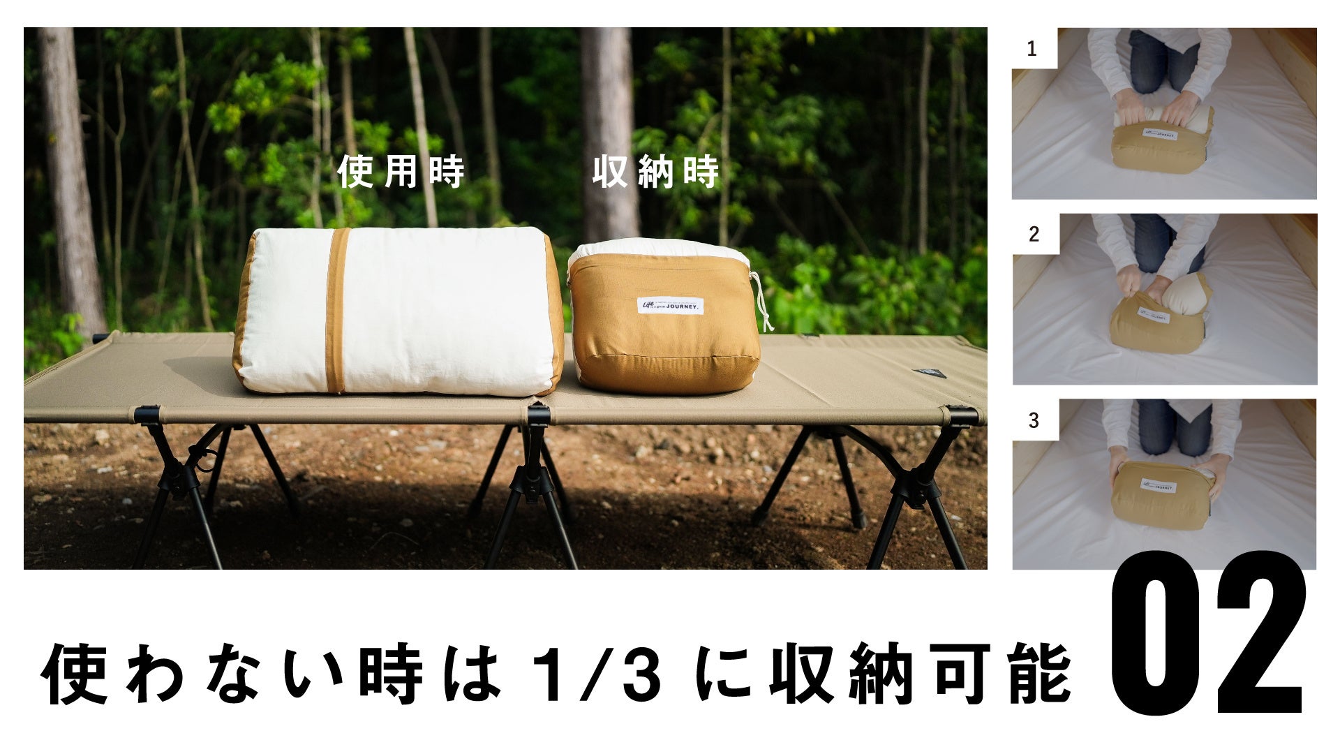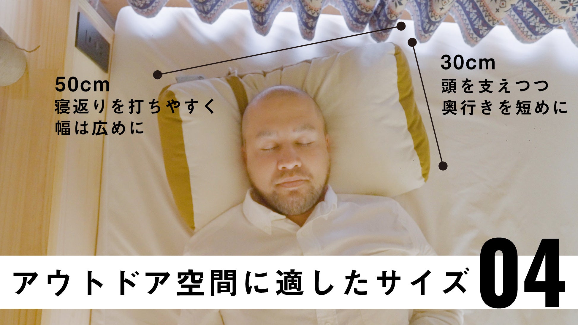 サイズもアウトドア用に調整。コットや車内などの狭い空間を想定し、奥行きは、狭くても体全体を休めるよう短めに、幅は寝返りを打ちやすく横向きでも十分な寝心地を感じられるよう広めに設計されています。
