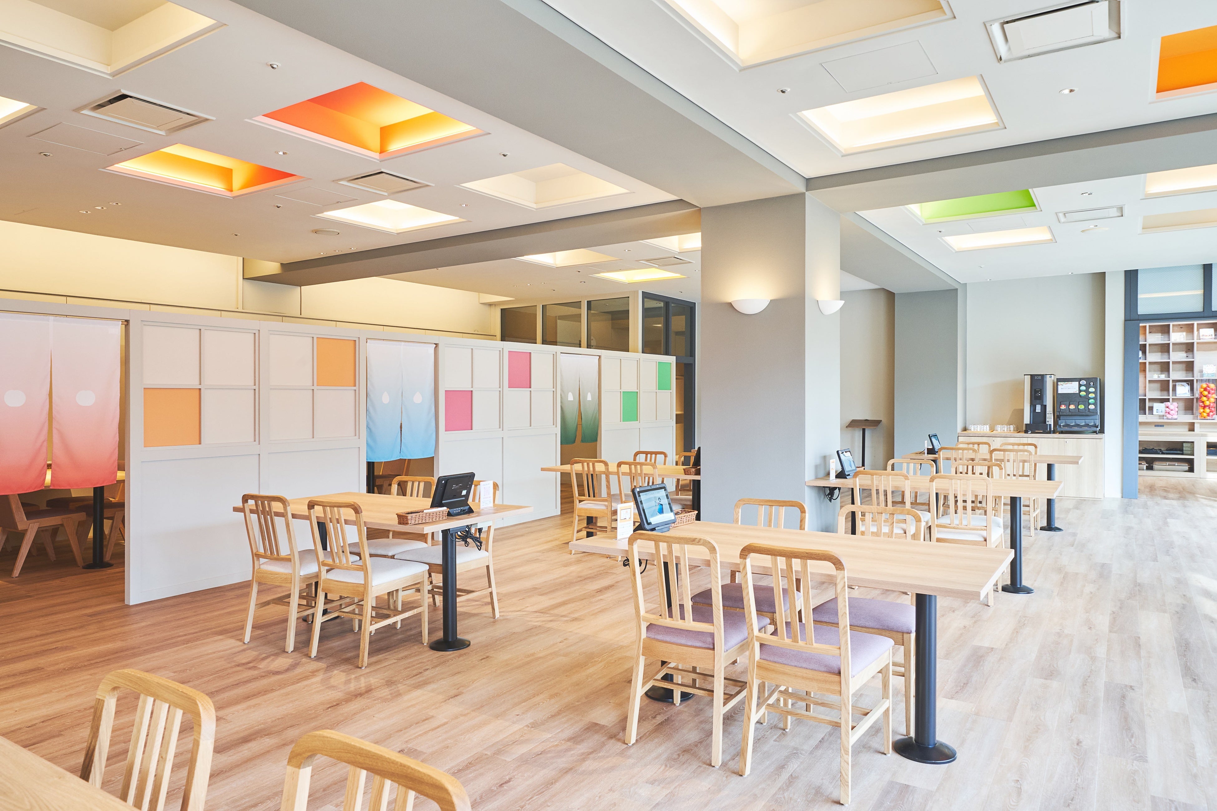 山形の素材やフルーツを使用した料理やスイーツが楽しめるお食事処。随所にコンセプトカラーをあしらった開放的な空間で、会話が弾むお食事時間をお楽しみください。