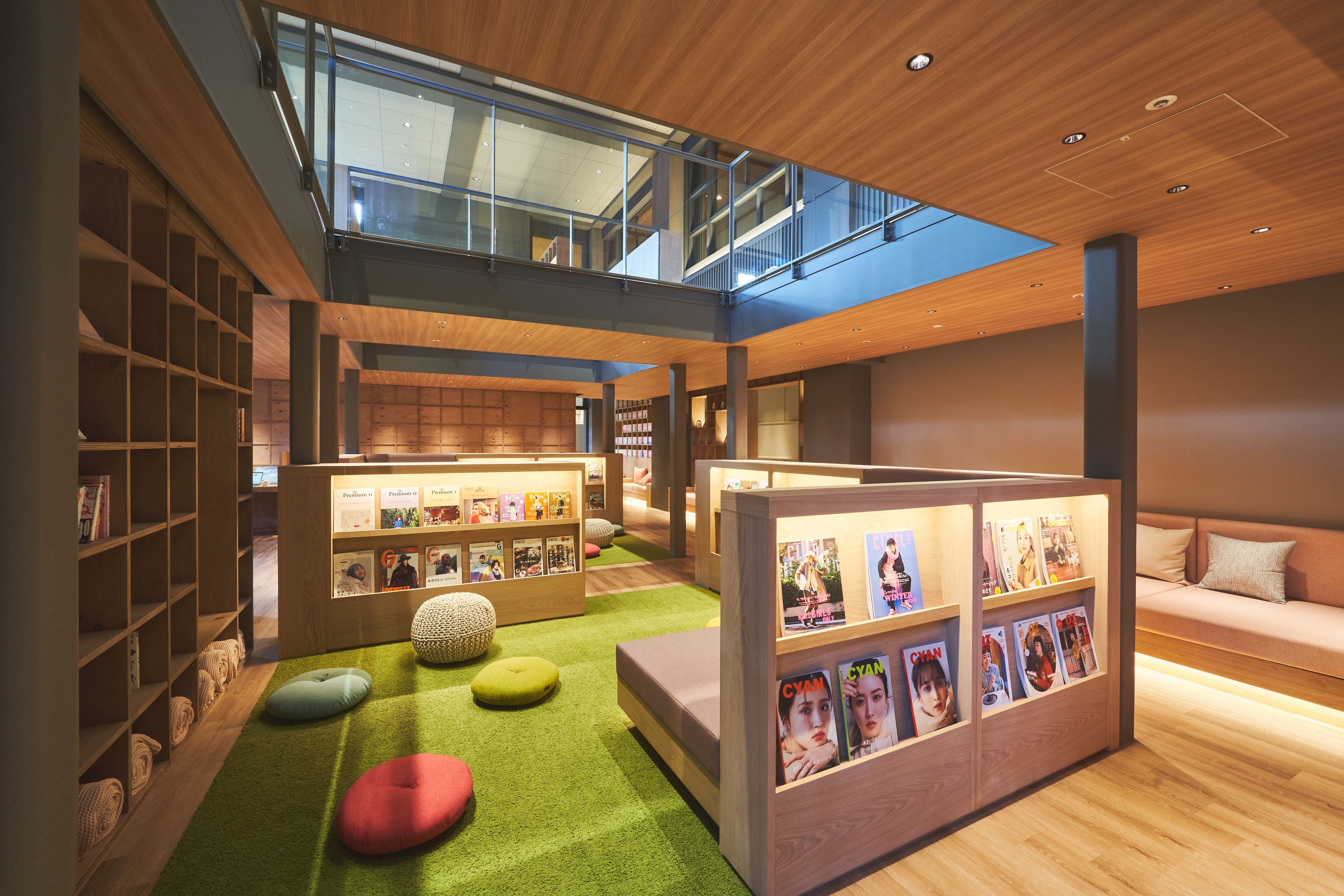 今回のリニューアルオープンの1番の目玉となるブックラウンジ&大階段。木を基調とした大階段には、館内にある 5,000 冊を超える本の中から厳選した書籍やクラフト・雑貨を陳列。お気に入りの空間を回遊しながらお過ごしください。ワーキングスペースも設置し、コワーキング利用にも対応しています。