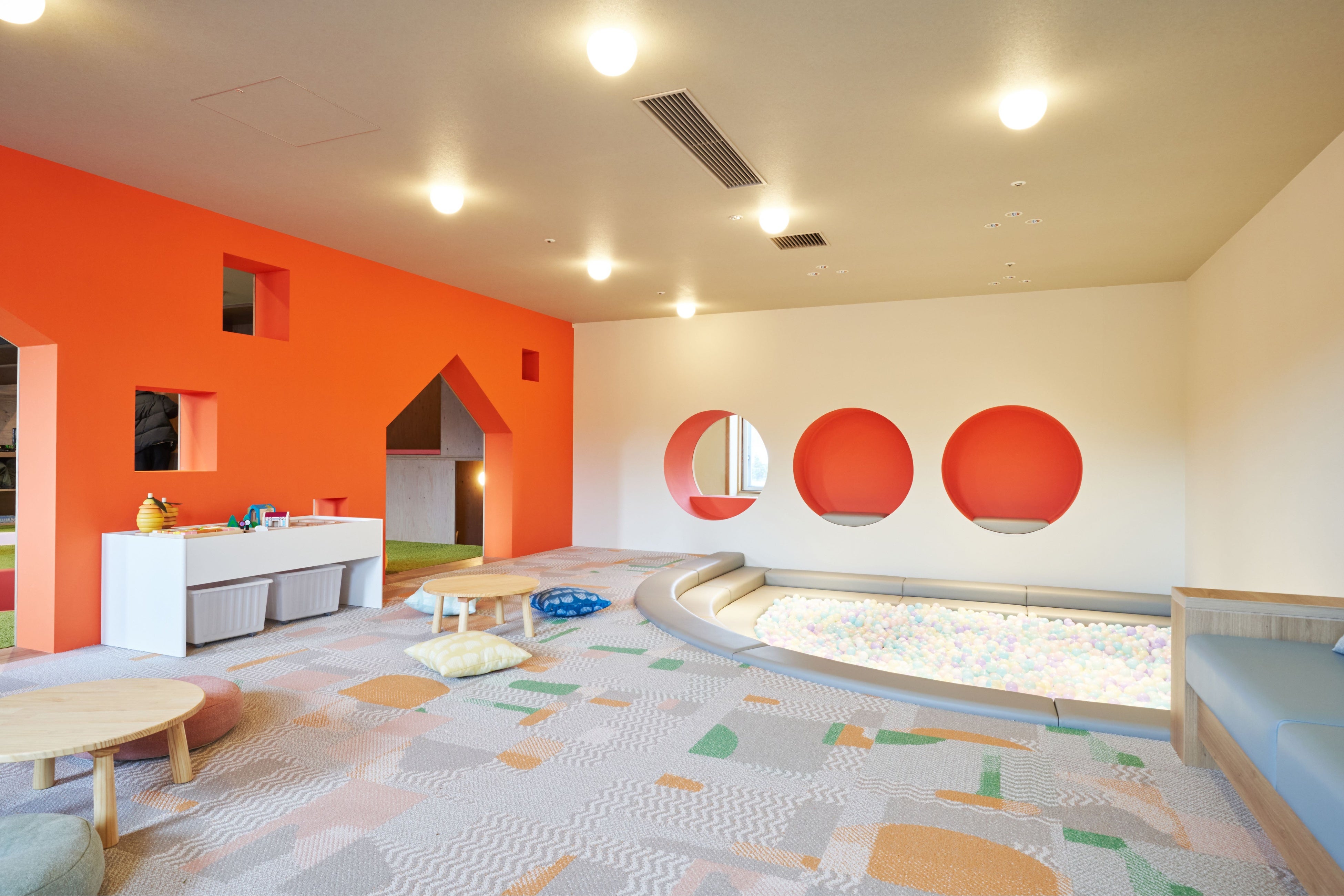 ボールプールや絵本など、小さなお子さまも楽しめるキッズスペースを完備。みんなで楽しくボールプールで潜ったり泳いだり。隣には大人も過ごせる休憩スペースも。