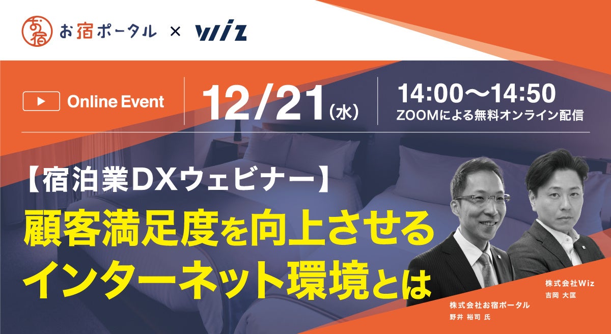 12月21日(水)、株式会社お宿ポータル・株式会社Wizは、ホテルや旅館のオーナー様・システム担当者の方に向け、顧客満足度を向上させるための環境構築についてお伝えするウェビナーを開催いたします。