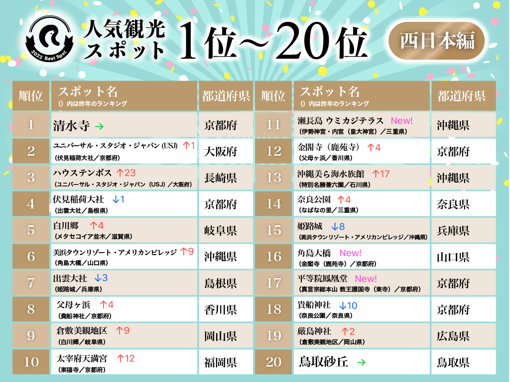 西日本では昨年に続き清水寺をはじめとした歴史的名所が上位を占めるなか、東日本と同じくテーマパークや水族館、複合施設などの順位上昇が目立ちました。今回ランクインした角島大橋は、数々のCM撮影や映画の舞台にも取り上げられ年々人気が高まり続けています。