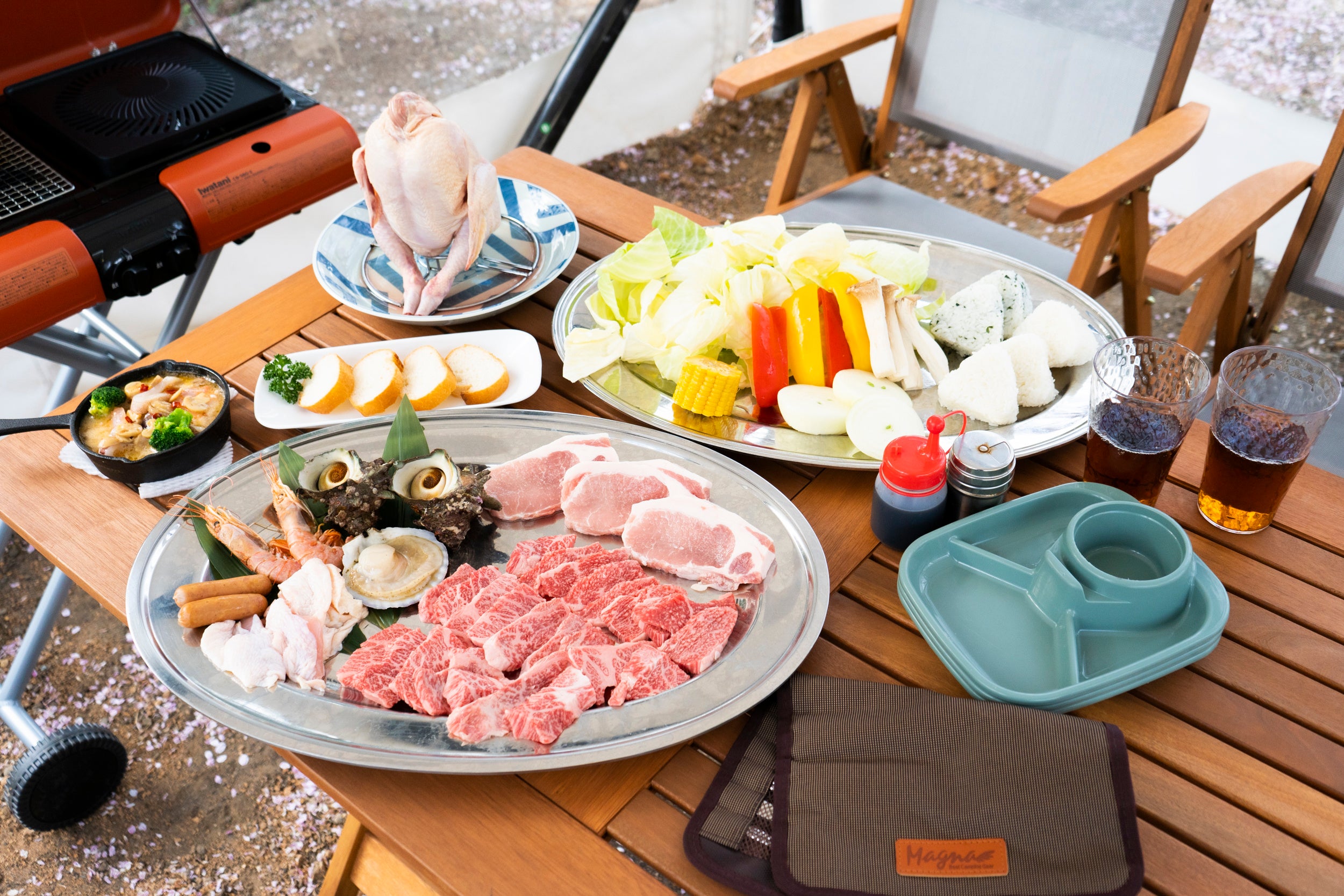 glampark 四季荘ならではのきめ細やかな霜降りでほのかな甘みが広がる島根牛と、山陰の荒波にもまれた活きのいいサザエなど島根県の地元食材をふんだんに使ったBBQコースがおススメ。