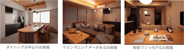 朝・昼・晩の食が暮らしの中心にある方、エンターテイメントのある楽しみが大切な方、和室でのびのびとくつろぎたい方など、ゲストのニーズに応えて、3つの部屋タイプを用意しました。キッチン家電付きのダイニングを中心に料理や団らんが楽しめるお部屋、プライベートシアター付きのお部屋、小上がりの和室のあるお部屋の中から、ライフスタイルや旅のメンバー、過ごし方に合わせて、好きなお部屋をセレクトでき、ご家族や友人と特別な体験を楽しめます。また、大画面のプロジェクターに最高の音響を組み合わせたシアター付きのリビング、美しいダイニングルーム、和テイストのローベッドと3つのタイプをいいとこ取りをした「プレミアムルーム」を2室用意。パーティーにもおすすめです。