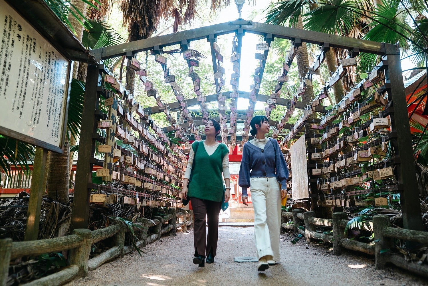 宮崎県宮崎市青島のほぼ中央に鎮座する神社周囲1.5kmの青島全島が境内地となっている青島神社。恋愛のパワースポットとして広く知られており、全国から恋人たちや女性参拝者が多く訪れます。絵馬で出来たトンネル「祈りの古道」、夫婦ビロウなど、見所やお願いができるスポットもたくさん。さらに、島を囲む国の天然記念物「鬼の洗濯板」など、絶景空間が広がります。