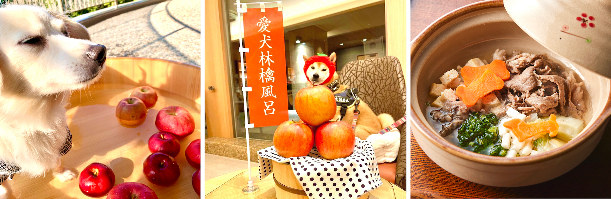愛犬用有馬温泉(銀泉使用)に国産りんごを浮かべ、愛犬がりんご風呂に入る様子は写真映えもばっちり。