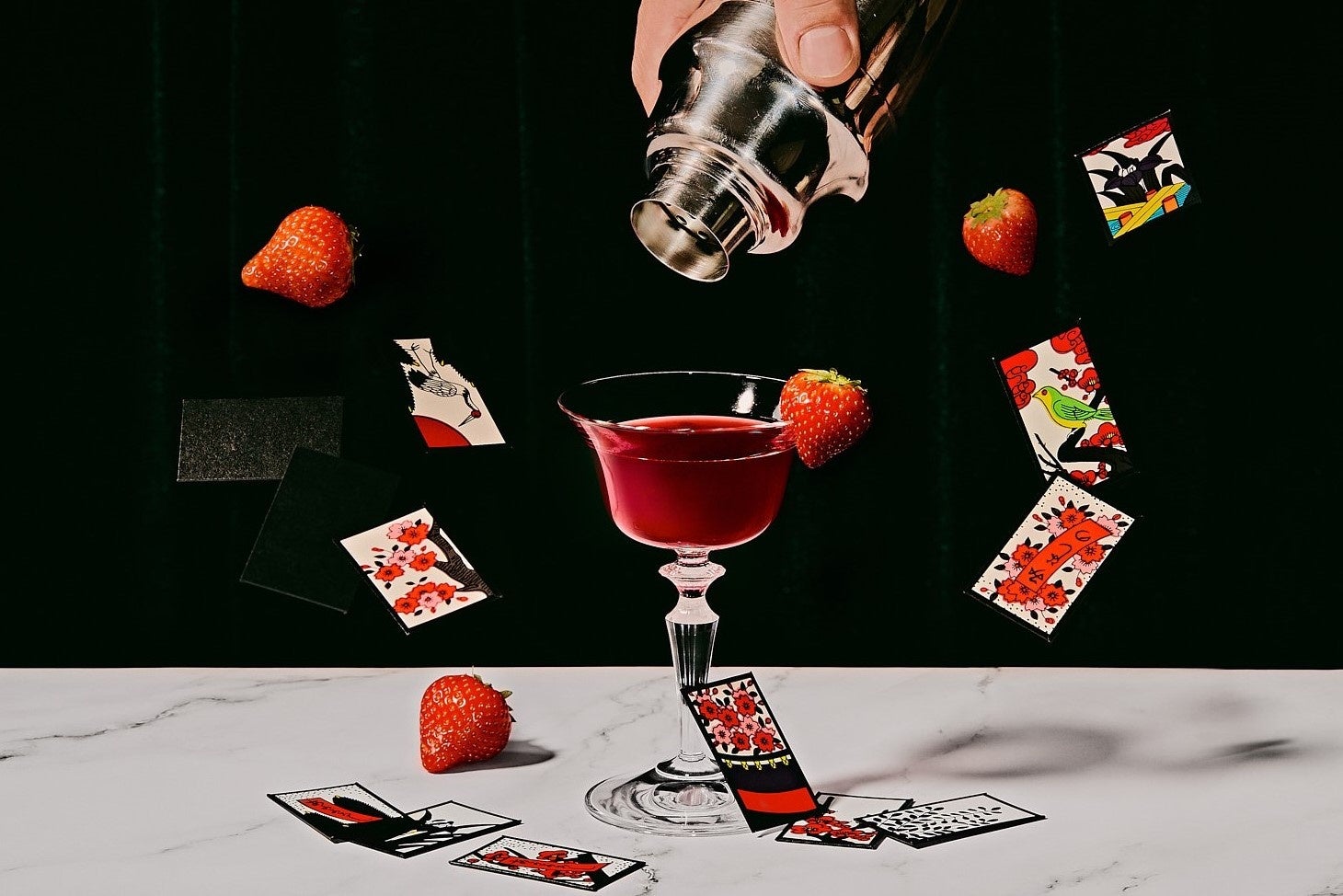 「花札」がテーマのストロベリーカクテルは、その月に旬を迎える品種のいちごを贅沢に使用し、バーテンダーが月札からインスピレーションを受けて創り上げます。1月のカクテルは、月札「松に鶴」にちなみ、その白い羽を人間の長寿者とかけて長寿のシンボルとされる「鶴」、冬でも緑生い茂る、生命力が強く縁起の良い「松」をイメージし、ホワイトカラーをベースに新年に相応しい華やかなストロベリーカクテルをご用意します。