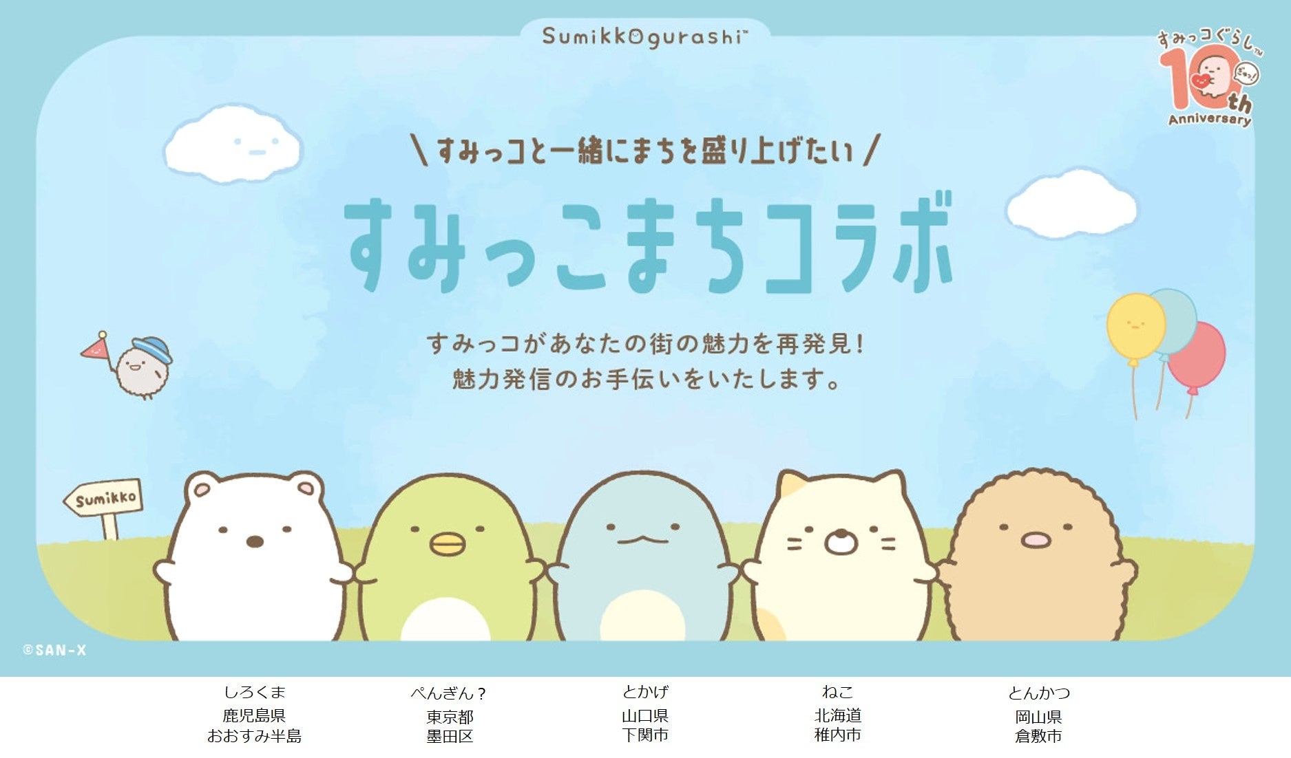 第1弾の鹿児島県おおすみ半島を皮切りに、第2弾の東京都墨田区、第3弾の山口県下関市、第4弾の北海道稚内市、そして今回の第5弾の岡山県倉敷市の全国5つの自治体とのすみっこまちコラボを展開し、“すみっこまち”ならではの情報を発信します。
