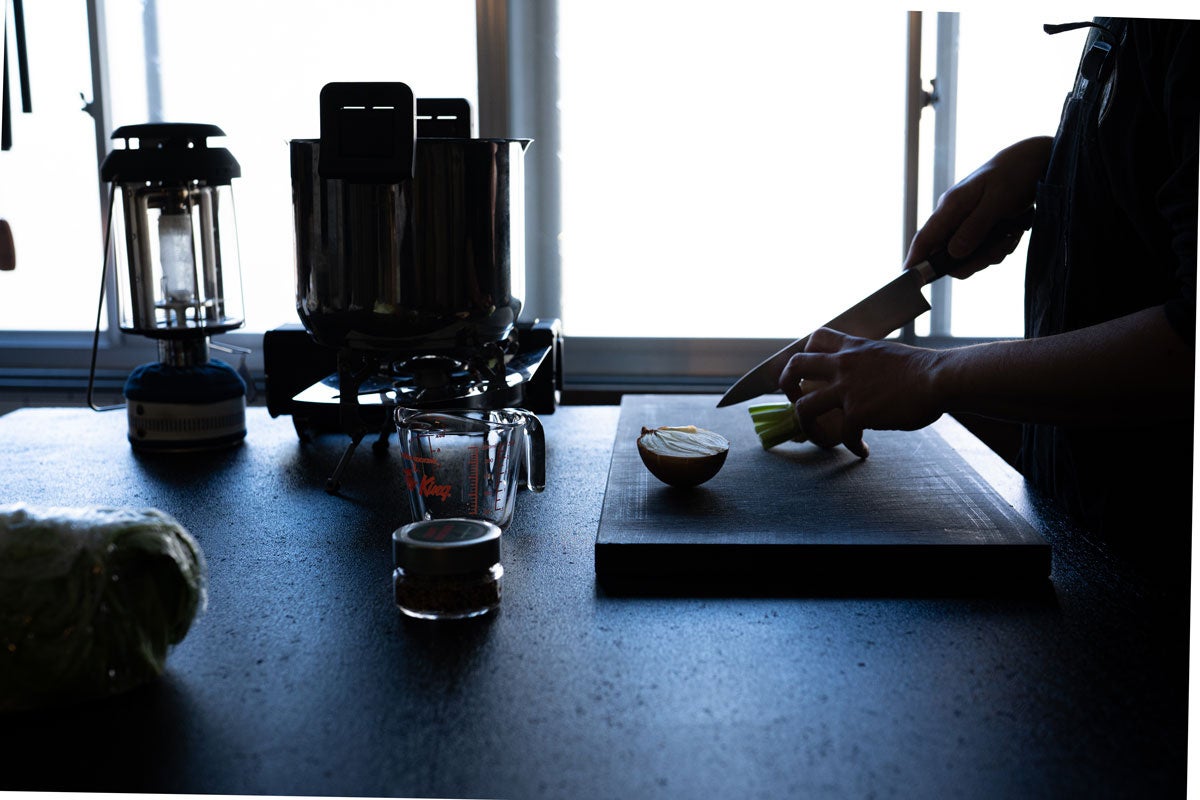 - 焚き火を囲んで夜ふかしした翌日。冷えたご飯を海老のビスクに入れてリゾットを作り、軽くチーズとブラックペッパーをかけて食べながら朝日を浴びる。