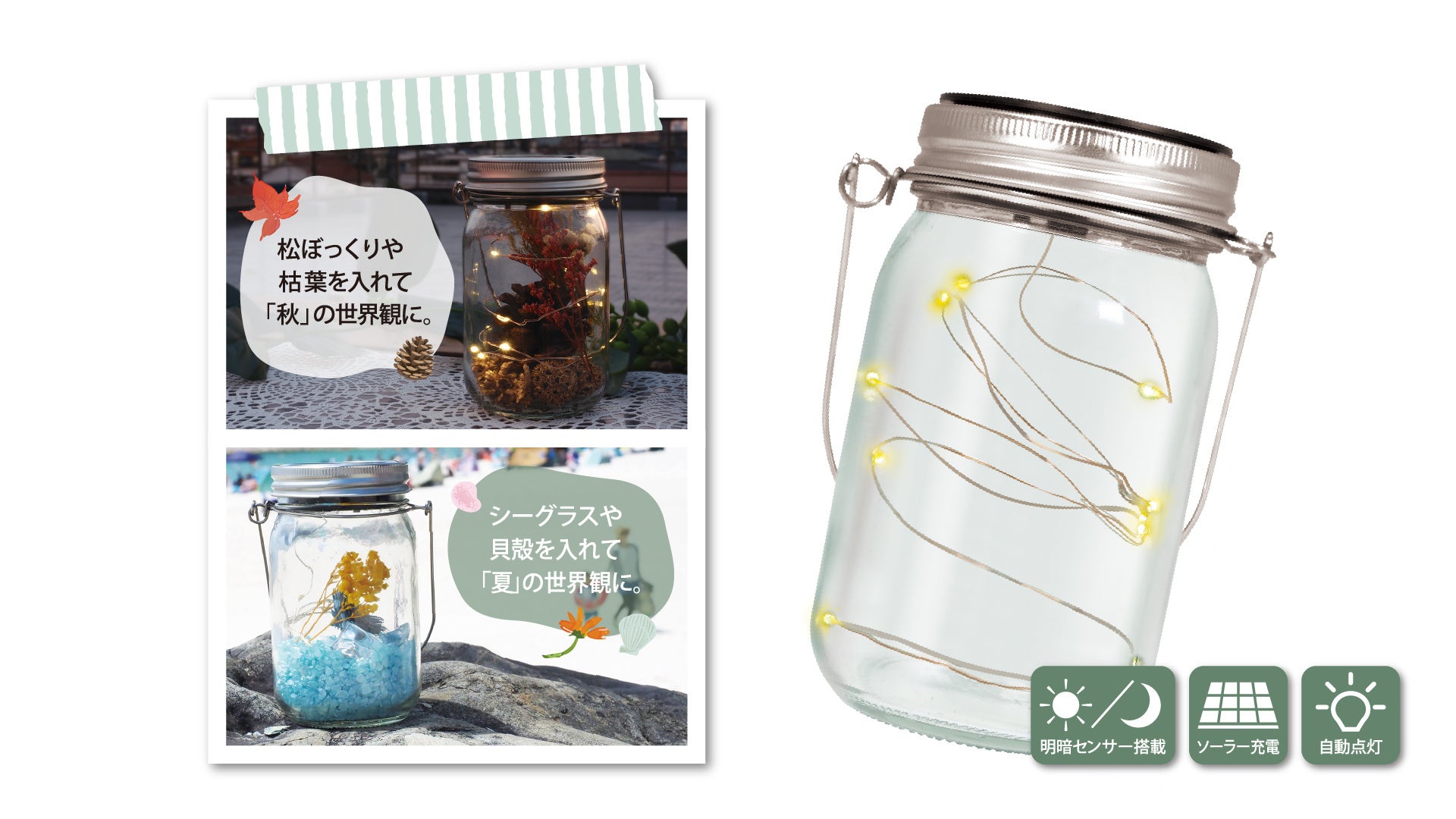 総合雑貨メーカーの株式会社ハック(本社:大阪府東大阪市、代表取締役:有山哲也)は、2022年11月お好みの材料でオリジナルライトを作れる「ソーラー充電グラスライト」を新発売。キャンプ場で集めた松ぼっくりや落葉を入れてアウトドアな世界観にしたり、海で集めた貝殻や砂を入れて「夏」の世界観にしたり。自由自在なアレンジで自分だけのオリジナルグラスライトを作ってみよう。