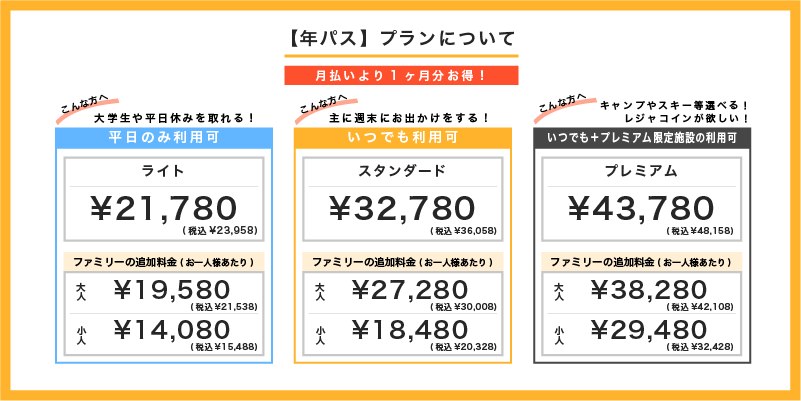 ※大人:18歳以上/ファミリー会員大人:13歳以上/ファミリー会員小人:12歳以