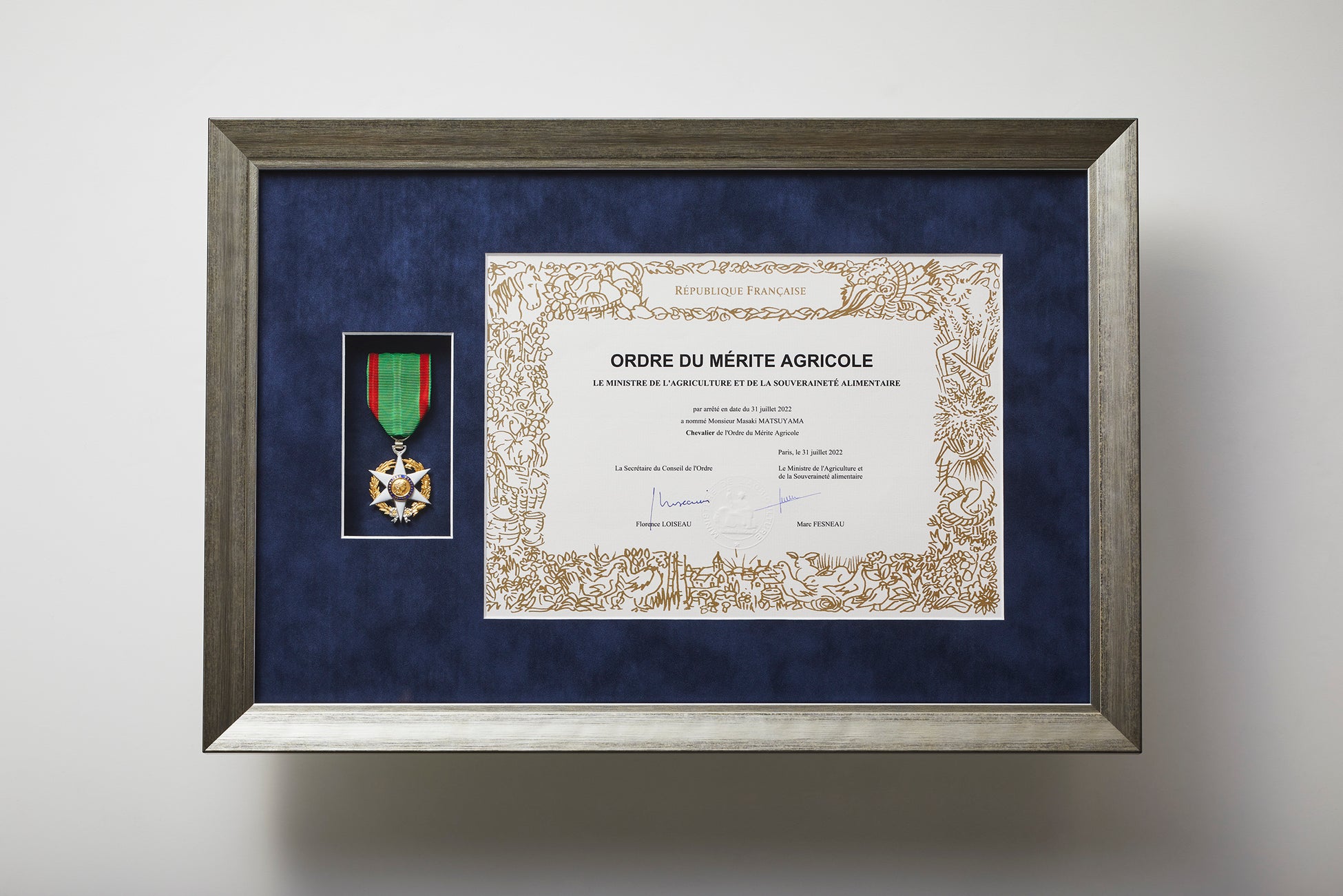 「フランス共和国 農事功労章」は、1883 年に創設されたフランス共和国農業・水産大臣より与えられる勲章の一つで、農業・水産省が、フランス農産物対外輸出、外国市場での販売促進、およびフランスの食文化の普及に特に功績のあったフランス人や外国人に授与する勲章です。