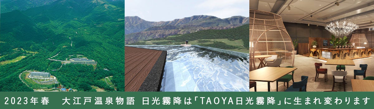 大江戸温泉物語ホテルズ&リゾーツ株式会社(本社:東京都中央区、代表取締役:森田満昌、以下 大江戸温泉物語)が運営する「大江戸温泉物語 日光霧降(栃木県)」(以下日光霧降)が2023年4月10日(月)、【TAOYA日光霧降】としてリブランド、関東初出店をいたします。これに先立ち2023年1月11日(水)より予約受付を開始いたします。