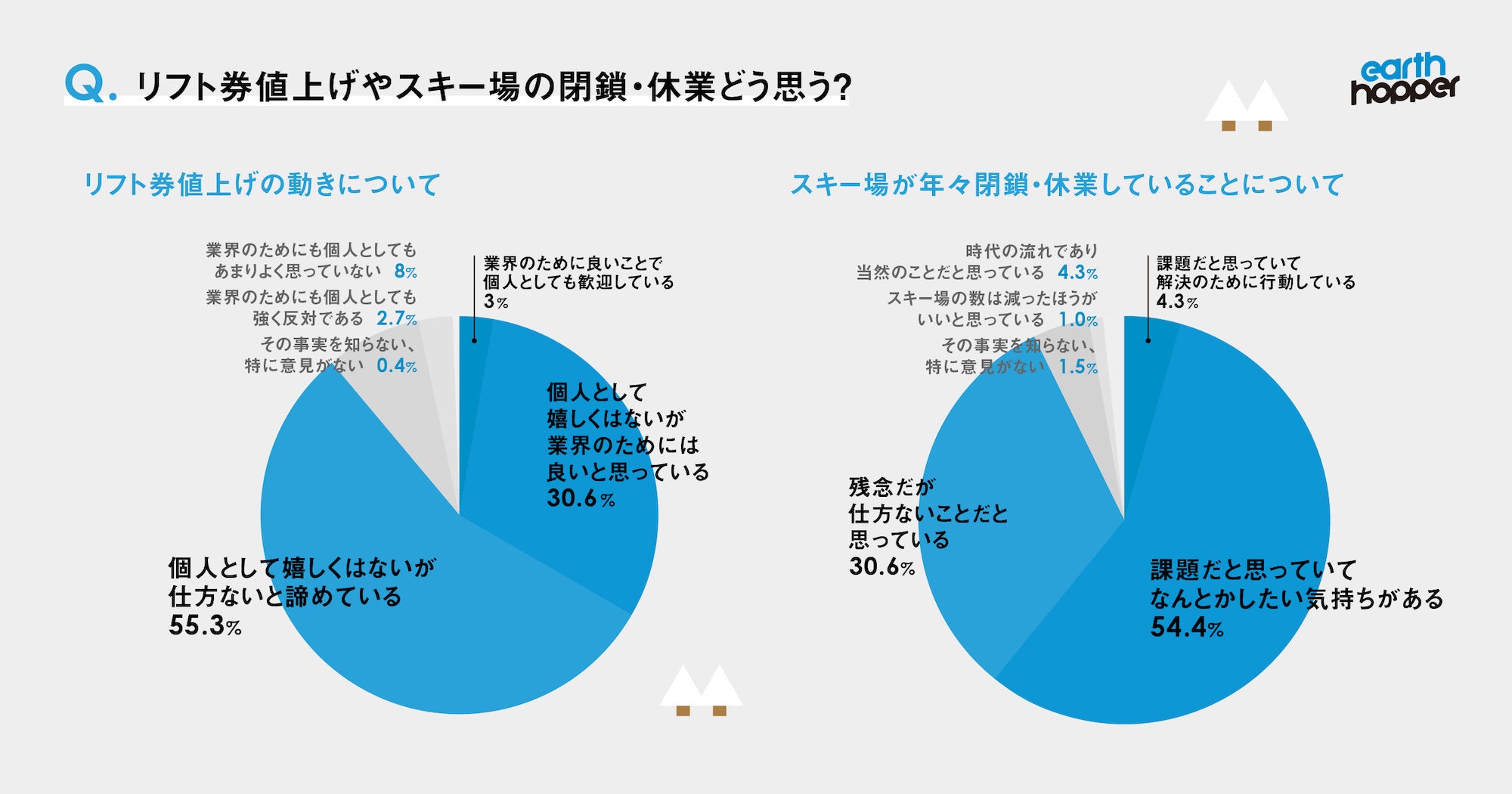 日本では近年、スキー場の閉鎖・休業が年を追うごとに相次いでいますが、それについての意見を聞いたところ「課題だと思っていてなんとかしたい」と答えた人が54.4%と、半数以上が課題感を持っていることがわかりました。特に今年は、燃料価格高騰などの社会情勢の影響を受け、リフト券の価格を値上げするスキー場が多くなっていますが、それについても「個人として値上げは嬉しいことではない」としながらも、「仕方ない」が55.3%、「業界のためには良い」が30.6%と、ネガティブな意見の10.7%を大きく上回りました。