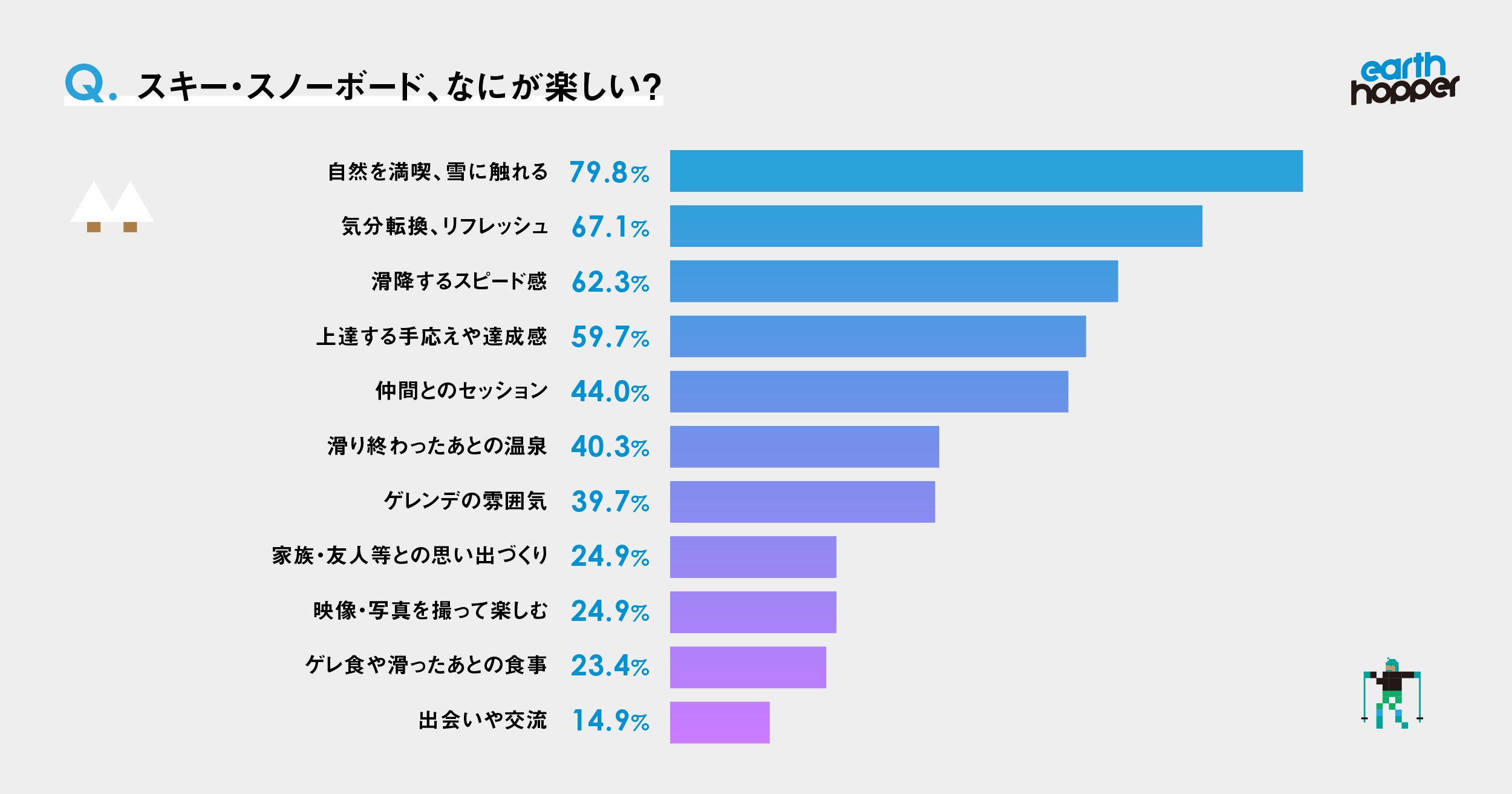 地球をホッピングするようにアーススポーツを楽しめる定額制オールシーズンパス「アースホッパー」を販売する株式会社Pioneerwork(本社:東京都台東区、代表取締役:後藤陽一)は、スキーヤー・スノーボーダーの最新実態とスキー場やスノー業界に対する意識を調査すべく、『スキー・スノーボードとスキー場に関する意識調査22-23』を実施しました。793名のアースホッパー会員(スキーヤーもしくはスノーボーダー)から回答が得られ、ウィンターシーズンの本格スタートに合わせてその結果を発表いたします。