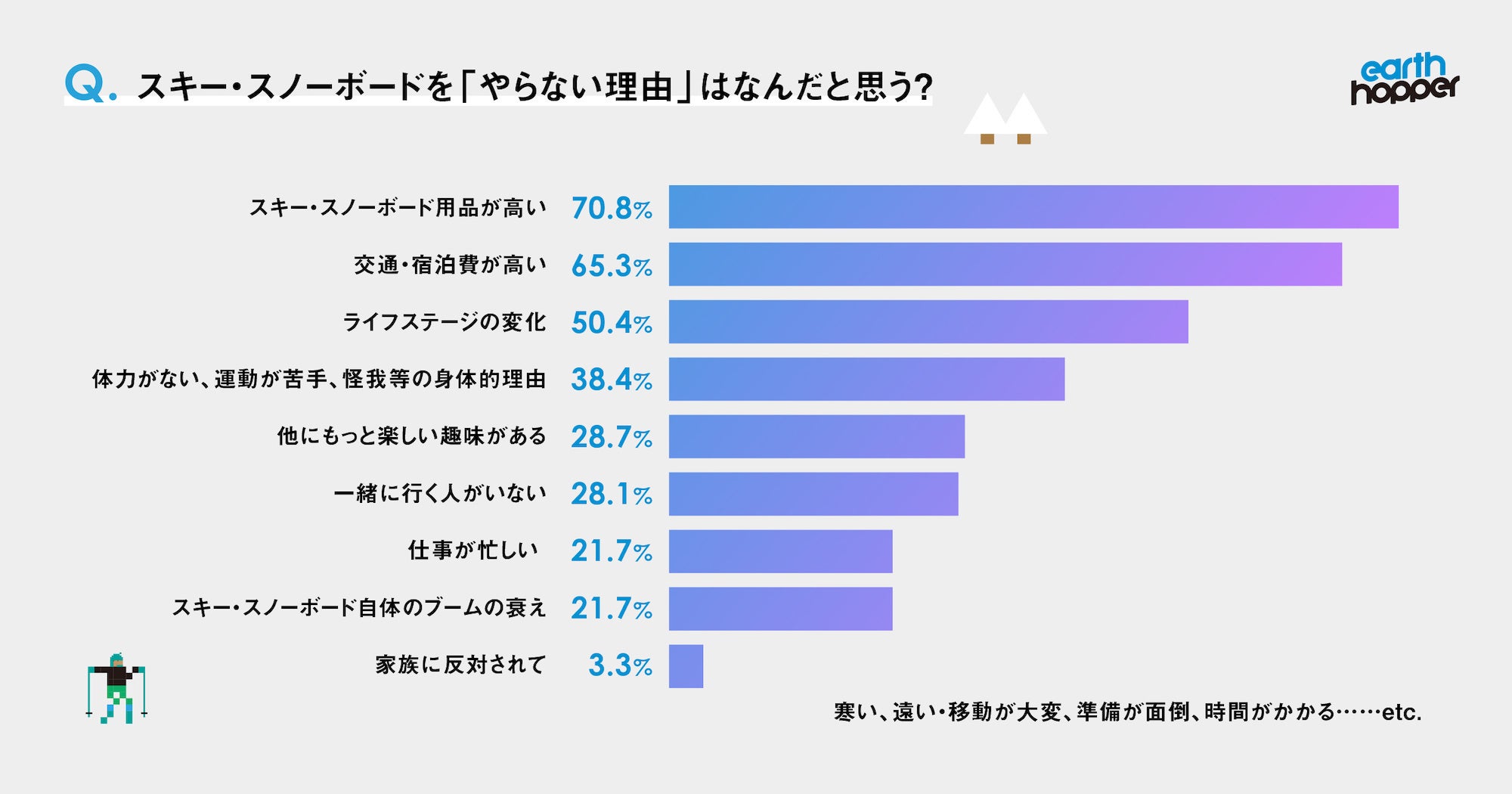 •  スキー・スノーボードを「やらない理由」は、「価格が高い」が圧倒的多数