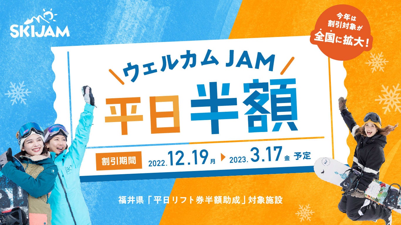 福井県が実施する「県内冬観光における誘客支援事業」により、平日限定でリフト券が定価から半額となります。昨シーズンは福井県在住者が対象でしたが、今シーズンより全国の皆様に対象が拡大となり、より多くのお客様に当スキー場をお得にご利用いただけるようになりました。