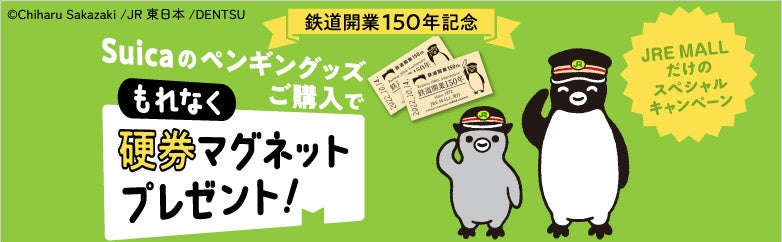 JR東日本は、鉄道開業150年を記念して「JRE MALL」で対象のSuicaのペンギングッズを購入すると、駅員さんに扮したSuicaのペンギンをあしらった硬券きっぷ型のマグネットをプレゼントするキャンペーンを実施中です。
