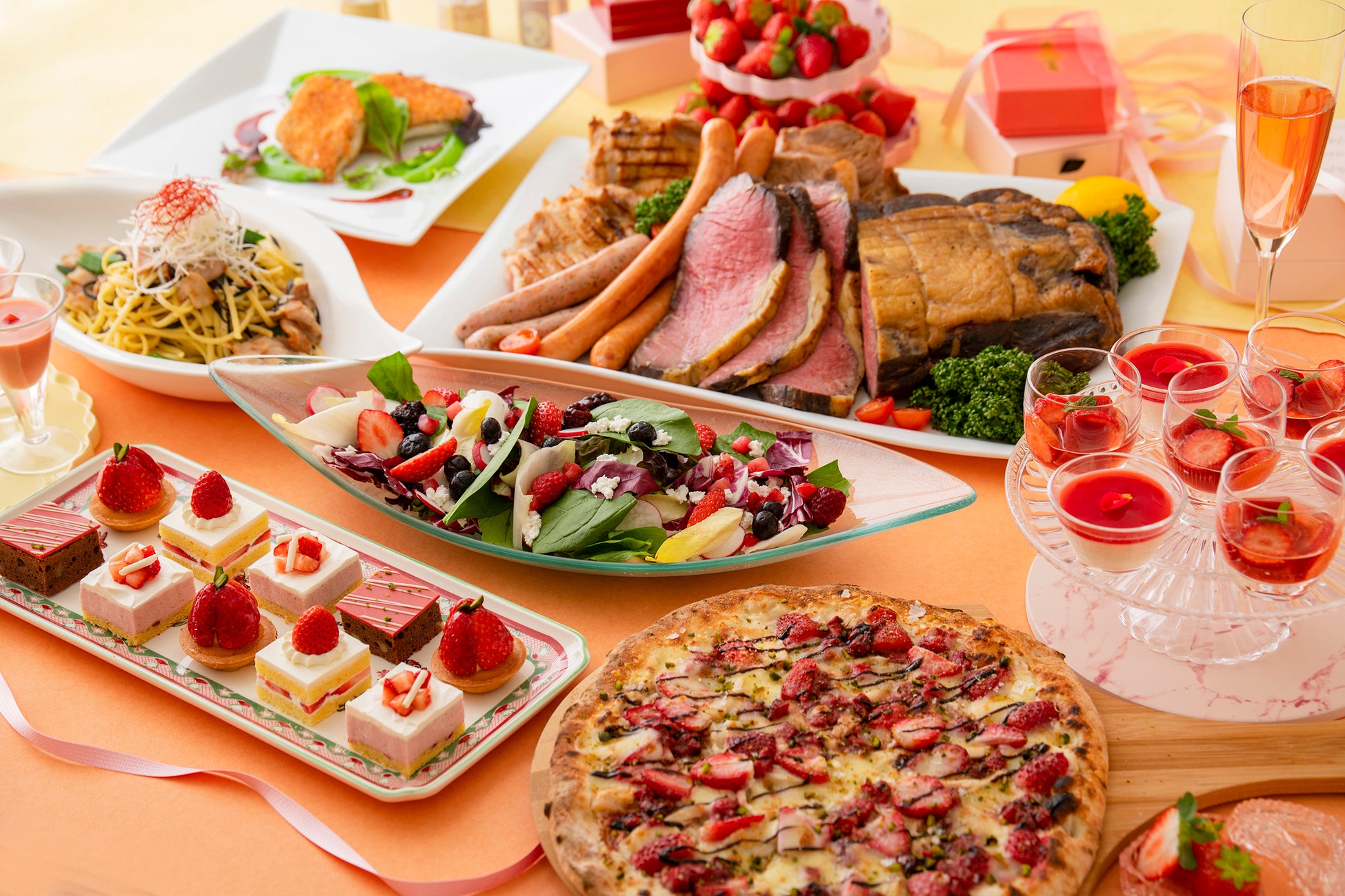 ショートケーキやジュレ、タルトなどのいちごスイーツのみならず、いちごとチキンのピッツァや白身魚のいちごクルート焼、いちごとアヴォカドのガスパチョ、3種のベリーとほうれん草のサラダなど、いちごを使ったシェフ考案のユニークなオリジナル料理の数々がブッフェ台に並びます。さらに、人気のローストビーフや職人が目の前で握る寿司など約60種類の多彩なメニューをお楽しみいただけます。