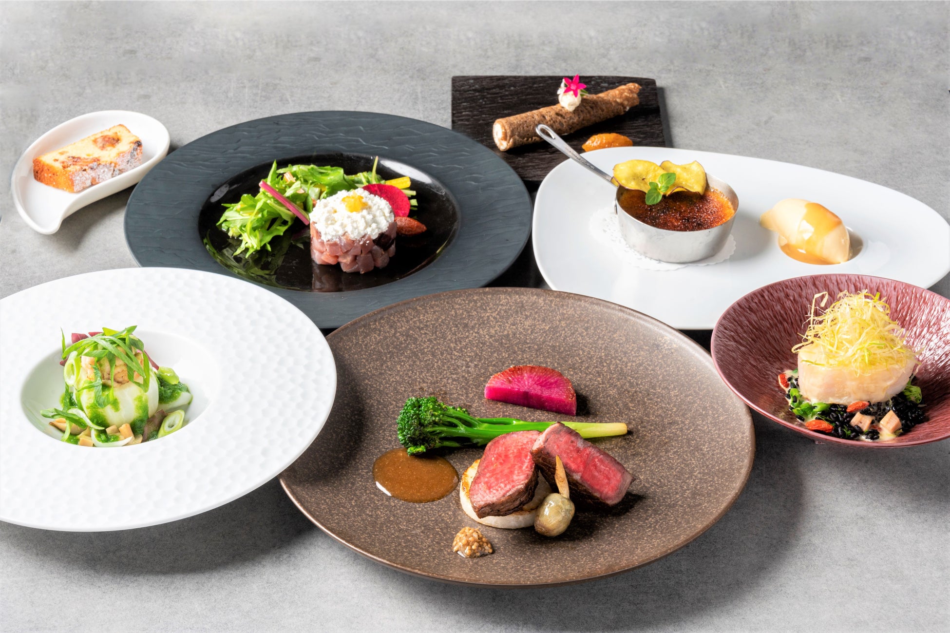 本コースでは「美味しく食べて健康促進」をテーマに、旬の日本海食材と発酵食品を融合させたオリジナリティー溢れるメニューをご用意します。冷前菜には冬の味覚、富山県産「寒ブリ」を軽くスモークし、とうがらしを発酵させた新潟県産「かんずり」を添えて提供します。ドレッシングには日本三大魚醤の一つである石川県能登半島名産「いしる」と、アクセントに柚子と合わせさっぱりとした仕上がりに。メインディッシュには、塩麴、赤ワイン、オリーブオイルでマリネした牛肉を低温でローストしご用意します。ディナーコースでは、秋田県産和牛の「みすじ肉」(甲骨の内側の部位)を使用いたします。付け合わせには、きめ細かく肉質が柔らかい加賀野菜で有名な「源助大根」と、みずみずしくほんのり甘味があり、ポリフェノールによる抗酸化作用が期待できる「紅くるり」をコンソメで炊き、こんがりと焼き色を付けご用意します。デザートには、きめ細かな粉質と上品な甘さが特徴のさつまいも「五郎金時」をクリームブリュレにアレンジ。添えたバニラアイスには「玄米甘酒」を加えたソースをあしらいました。