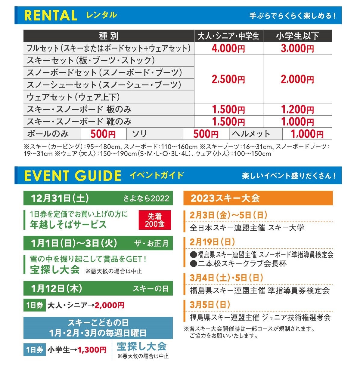 今シーズンの「あだたら高原スキー場」では、お子様にもより楽しんでいただけるよう、毎週日曜日を「こどもの日」に設定し、小学生以下のお子さまのリフト1日券が1,300円(通常料金2,600円の半額)でご利用いただけるほか、宝探し大会などの参加型イベントも期間中多数実施いたします。