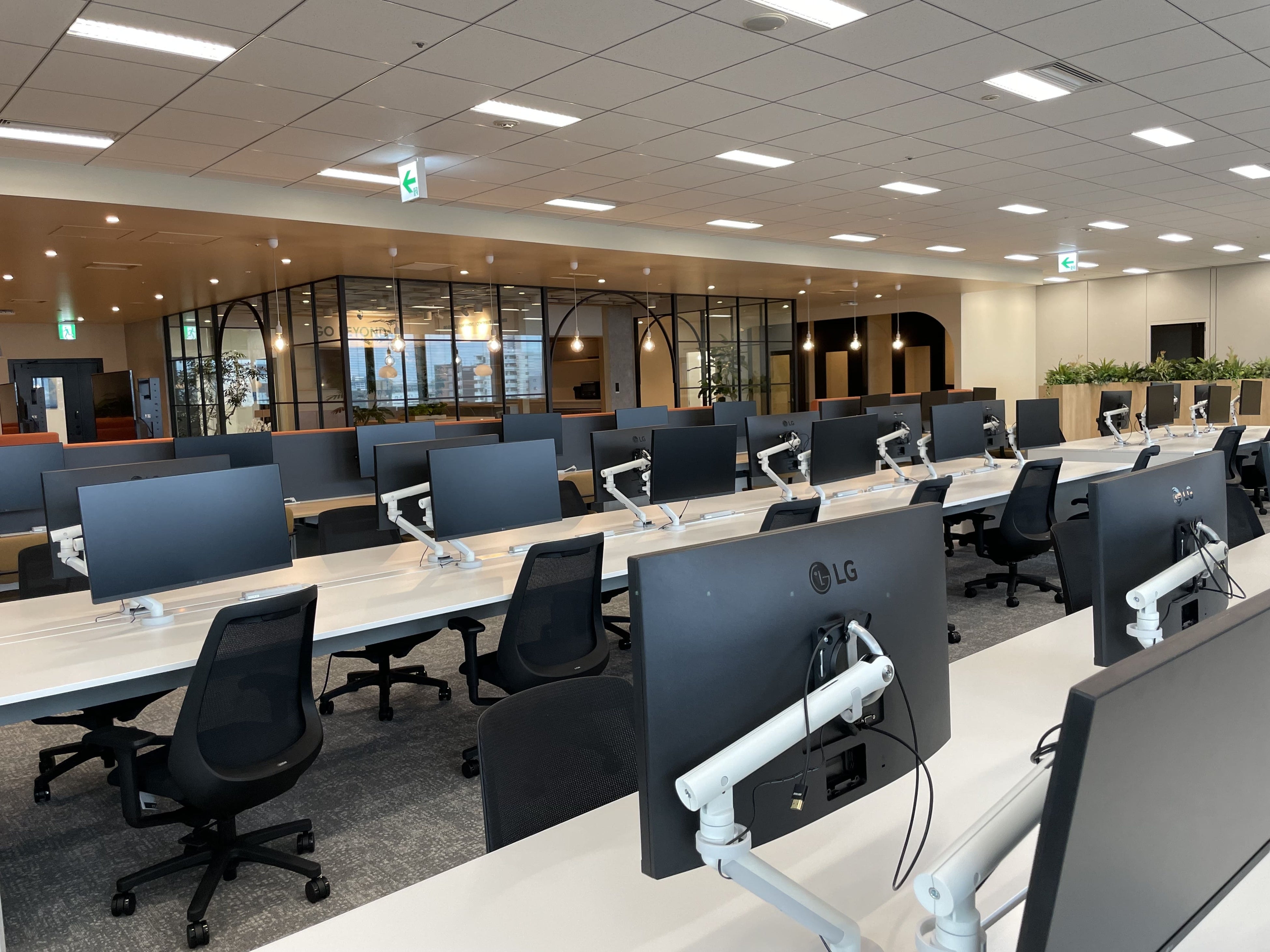 圧迫感を軽減し、責任者との距離を縮める効果を期待し、全席フリーアドレスにしました。アーム付きのモニターを配置したテーブル38席とカウンター10席、集中業務に対応するためのパーテーションブース3席、さらにオンラインミーティング対応したWEBブース3部屋を用意し、業務の目的にあった席を選択できるようにしています。