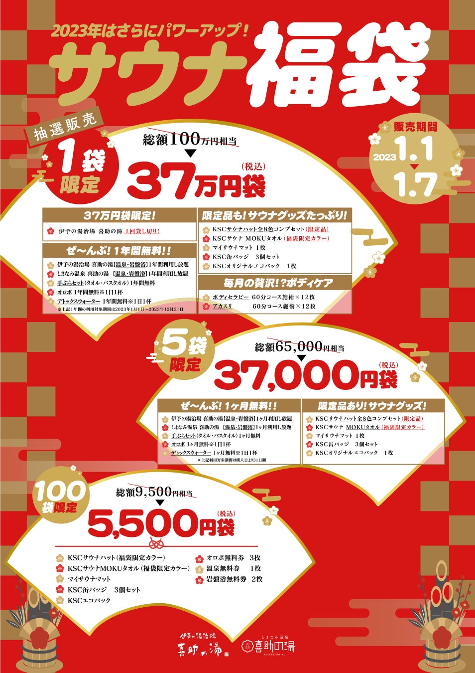 愛媛県で「伊予の湯治場  喜助の湯」「しまなみ温泉 喜助の湯」を展開する総合エンターテイメント企業・キスケ株式会社(本社:愛媛県松山市、代表:山路義則)は、サウナーを日本一応援する施設を目指す「kisuke Sauna club」(キスケ サウナ クラブ、以下kSc )がプロデュースするサウナ福袋 全3種類(37万円、3万7千円、5千5百円)を、2023年1月1日(日)より数量限定で発売いたします。
