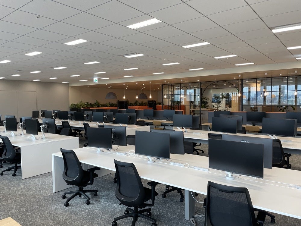 圧迫感を軽減し、責任者との距離を縮める効果を期待し、全席フリーアドレスにしました。アーム付きのモニターを配置したテーブル38席とカウンター10席、集中業務に対応するためのパーテーションブース3席、さらにオンラインミーティング対応したWEBブース3部屋を用意し、業務の目的にあった席を選択できるようにしています。