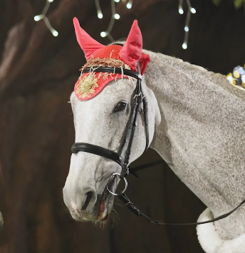 カクテル光線に映える、ナイキスターゲイザの白みがかった芦毛の馬体が、