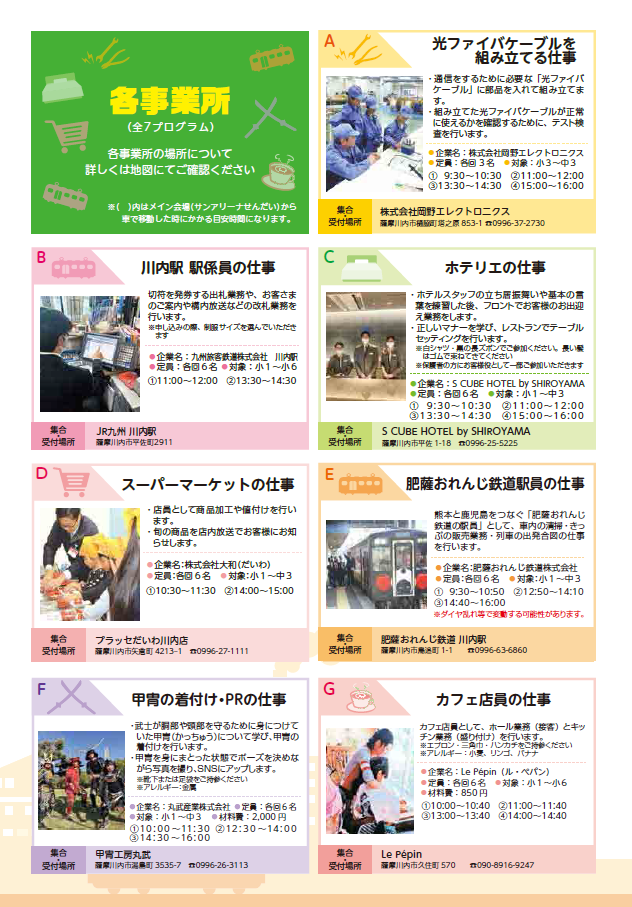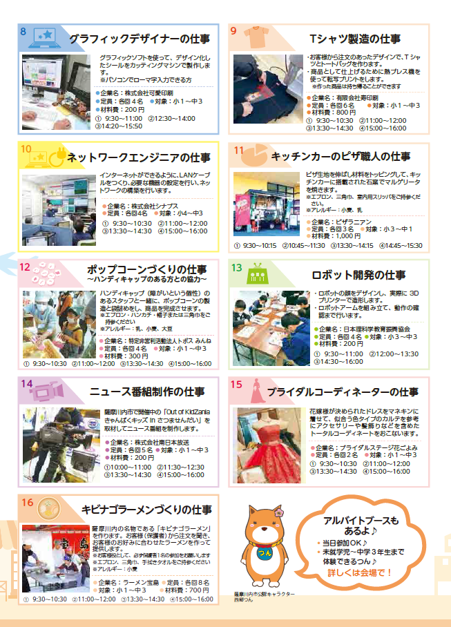 本イベントでは、地域のこども達に体験を通じて地元企業の仕事を知り、郷土愛を育んでもらいたいという薩摩川内市の思いのもと、23種類のプログラムを提供します。前回と同様に「キビナゴラーメンづくり」や「肥薩おれんじ鉄道社員」など鹿児島ならではの仕事体験を提供するほか、当日申し込みが可能なプログラムとして、「アルバイトブース」が初めて登場します。また、仕事体験のあとには給料として本イベント専用通貨「きゃんドル」が支給され、イベント会場や市内の「駅市」での買い物で利用できます。