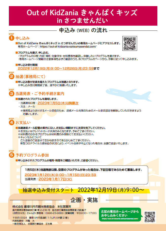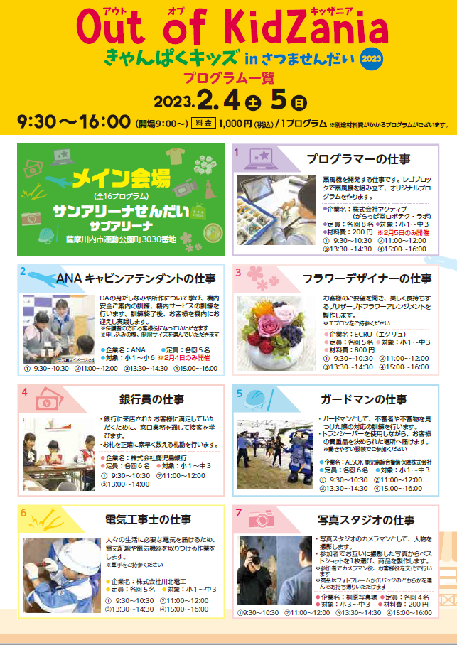 参加方法:専用サイト https://out-of-kidzania-satsumasendai.com/ より事前予約