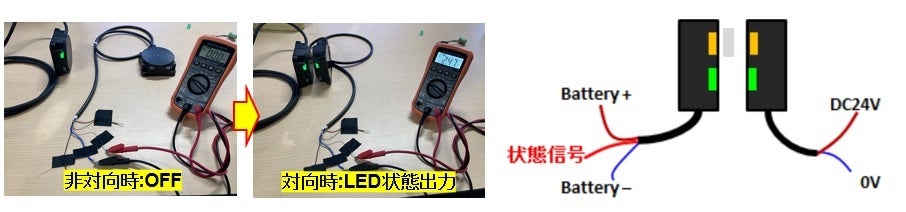 活用が進む中で、充電状態などのLED情報を外部で活用したいというニーズが多いことから、信号出力タイプを製品化。対向するとLEDの状態に合わせ信号を外部に出力します。これにより、外部機器の制御や、より大きなLEDでの状態点灯などさらに活用の幅が広がります。