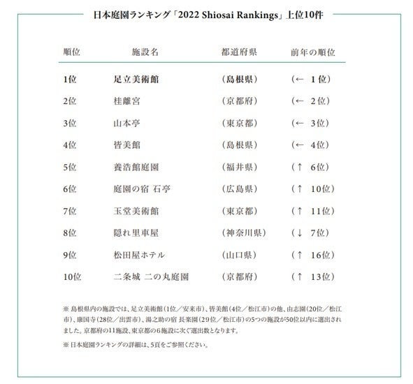 足立美術館(島根県安来市古川町320/館長・足立隆則)はこの度、アメリカの日本庭園専門誌が主催する日本庭園ランキング(「2022 Shiosai Rankings」)で、当館の日本庭園が1位に選出されたことをご報告いたします。これにより、本ランキングの第1回(2003年)以来、20年連続で日本一に選出されたこととなります。 この日本庭園ランキングは、アメリカの日本庭園専門誌『数寄屋リビングマガジン(ジャーナル・オブ・ジャパニー ズ・ガーデニング)』(Sukiya Living Magazine: The Journal of Japanese Gardening)が1年間の調査をもとに選定するものです。日本国内の日本庭園約1000か所を対象とし、各国の庭園および造園の研究者・専門家など30人前後で構成される委員会が、庭園の質、庭園と建物の調和、利用者へのホスピタリティなどを基準に選考するとしています。先日、公式ホームページ(https://gardenrankings.com/ )にて、2022年のランキングとして上位50件が掲載されました。
