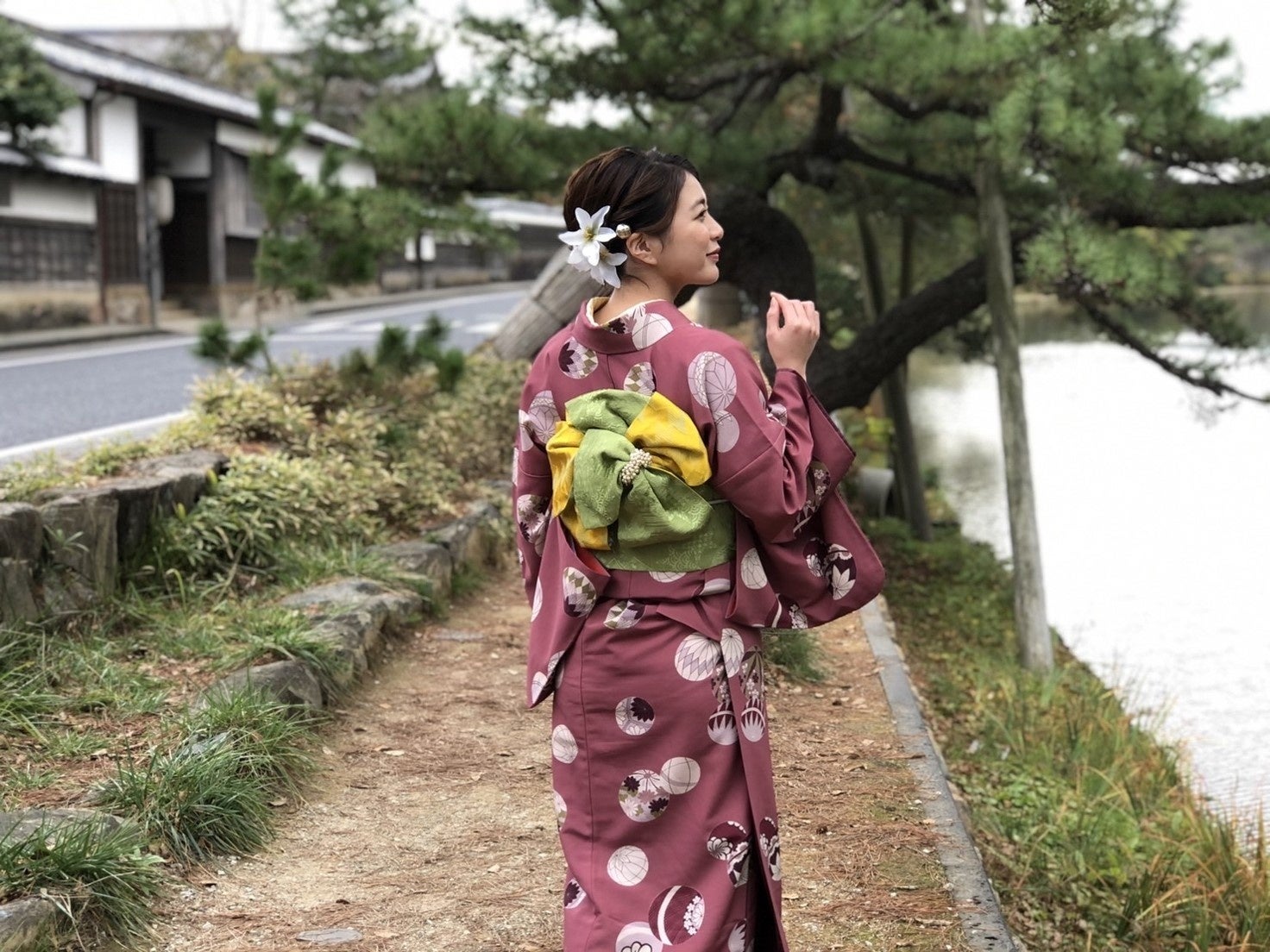 松江城や塩見縄手の近くにある着物レンタル専門店。モダンなものから伝統的な柄など、さまざまな着物を1000円OFFでレンタルできます。お気に入りの着物で風情ある松江の城下町を散策にお出かけしませんか。