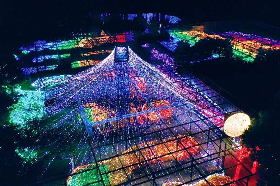 「ジャポニスム・イルミ」をテーマに、日本庭園が130万球のイルミネーションでカラフルかつ美しく彩られます。中四国最大規模の水中イルミやプロジェクションマッピング、音と光が競演する空間など見どころも満載。光の中をくぐったり、庭園を見下ろしたりのぞいたり、体験しながら和と光の共演を楽しむことができます。
