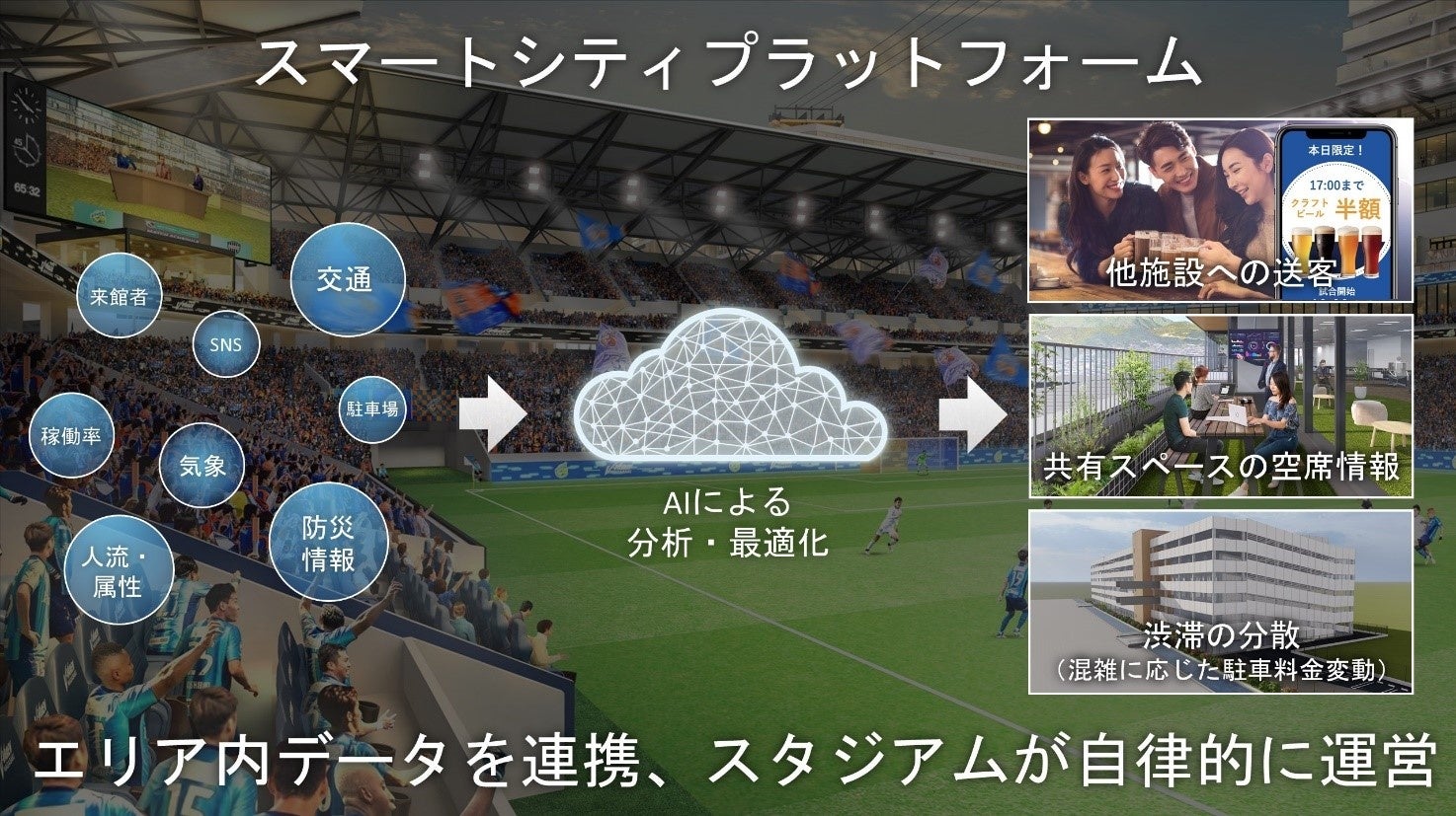 スタジアムシティ内に設置したセンサーなどから収集した人流データを、ソフトバンクのスマートシティプラットフォームで分析して、混雑状況などの情報をサイネージや専用アプリで表示することで、来訪者が混雑を避けて快適に過ごせる滞在型のスタジアムシティの実現を目指します。また、各施設の混雑状況に応じて、サイネージや専用スマホアプリに販促情報を配信するなど、来訪者にメリットのある情報提供を通じて自然な形で混雑緩和が実現できるような仕組みを検討します。