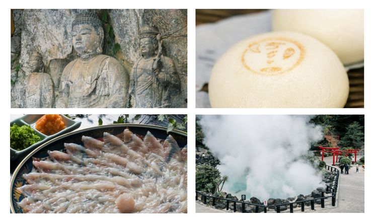 温泉や地獄めぐりなどで有名な「地獄」の別府。食文化や国宝臼杵石仏などで有名な「仏」の臼杵といった、特色あるまちが車で約1時間の距離にあります。