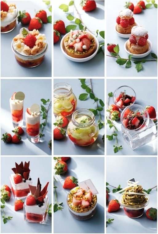 中左から:苺と桃のスープ フロマージュブランのクリーム、苺と葡萄のマチュドニア、苺とチョコレートのクランブル下左から:苺のティラミス、苺とクリスピーチョコ、苺のマリネとピスタチオのモンブラン