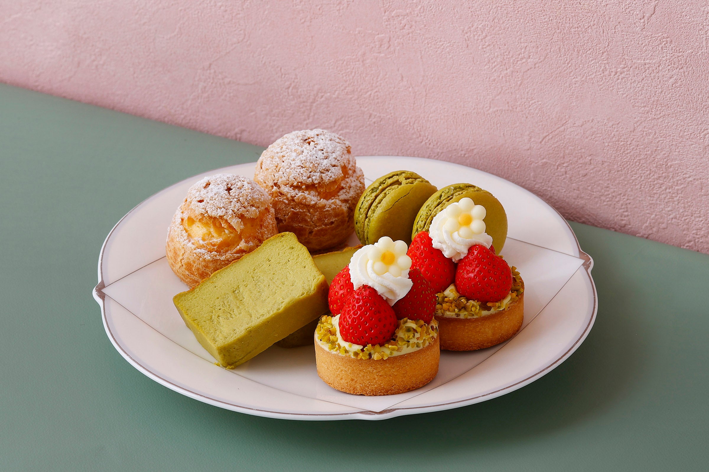 上左から:苺とオレンジのマリネ クランブル添え、タルトフレーズピスタチオ、苺のシュークリーム