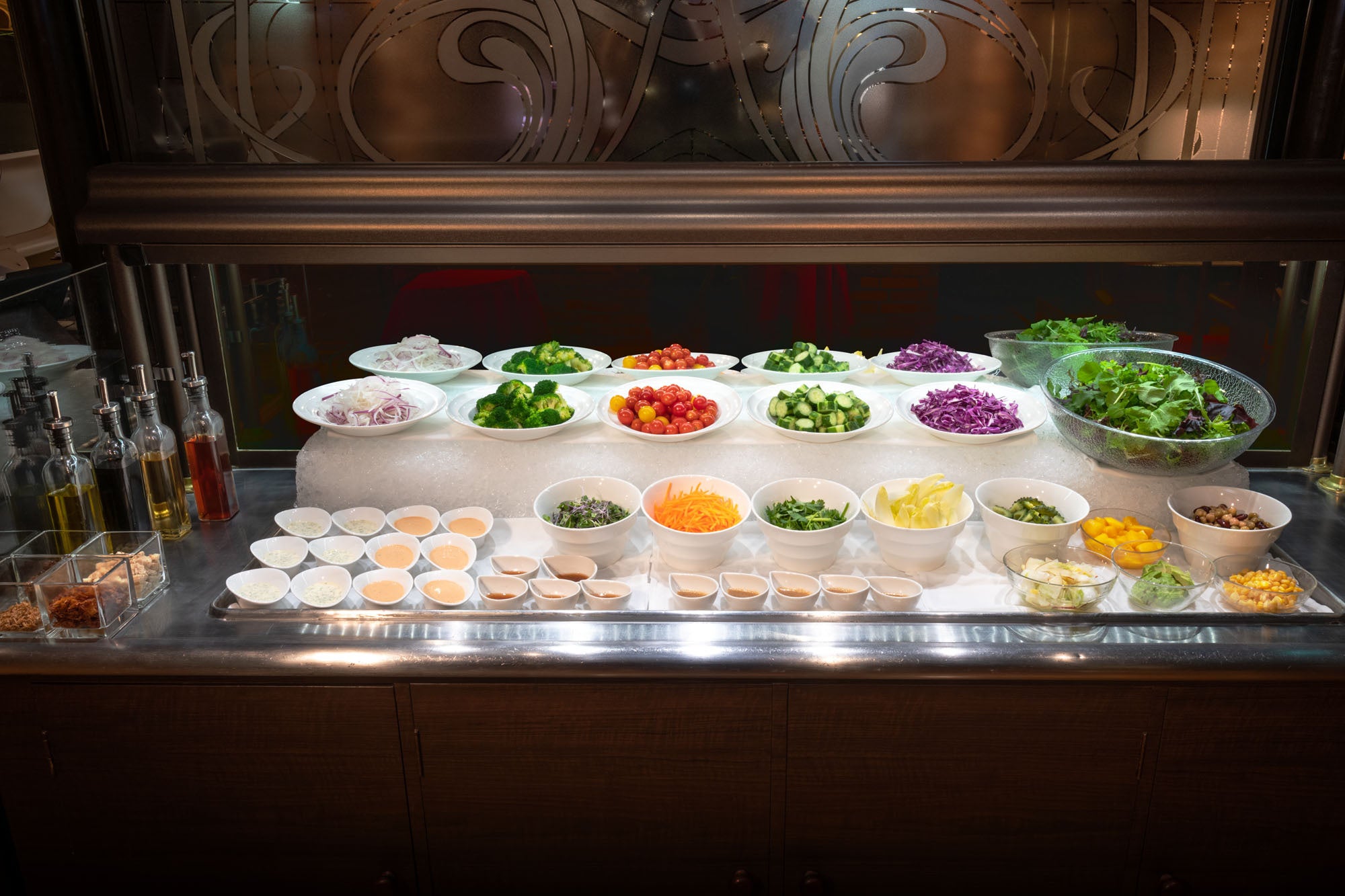 お肉の魅力をより引き立たせてくれるのが、「RIB ROOM」もうひとつの名物『健康野菜のサラダバー』です。安心してお召し上がりいただくために、ホテルニューオータニ専用の畑で収穫される栄養価の高い新鮮な野菜や、秦野名水で水耕栽培されたみずみずしく柔らかい野菜など、シェフが選びぬいた野菜が勢揃い。他では味わうことのできないニューオータニオリジナルのドレッシングもご用意しております。