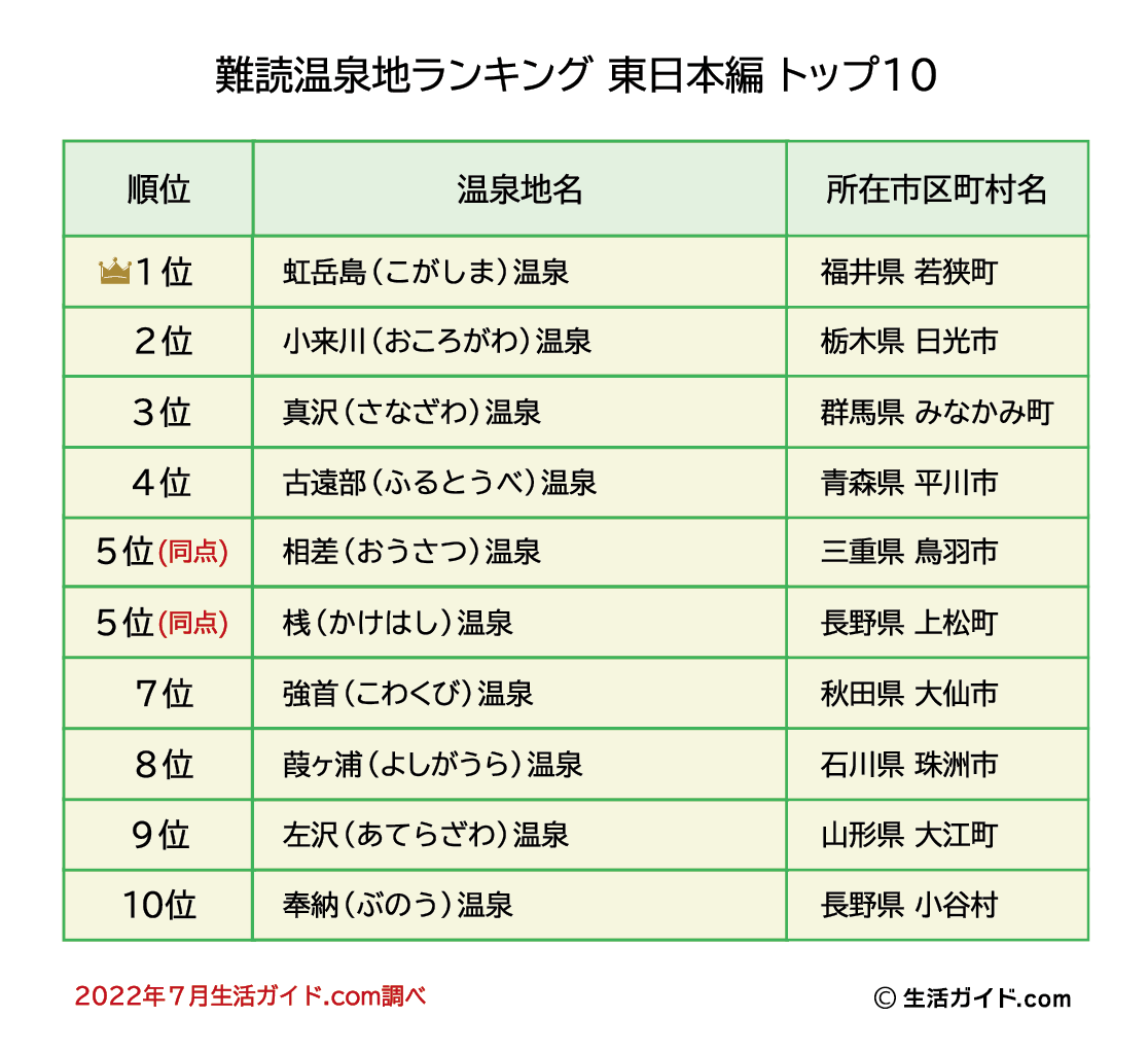 このランキングは、生活ガイド.comが厳選した東日本にある「難読温泉地」を、クイズ形式(読めるor読めない)にし、生活ガイド.com会員に回答してもらいました。読めなかった場合には、その温泉地に1票が入れられ、読めなかった票が一番多い温泉地を1位とし「難読温泉地ランキング 東日本編」として発表いたしました。